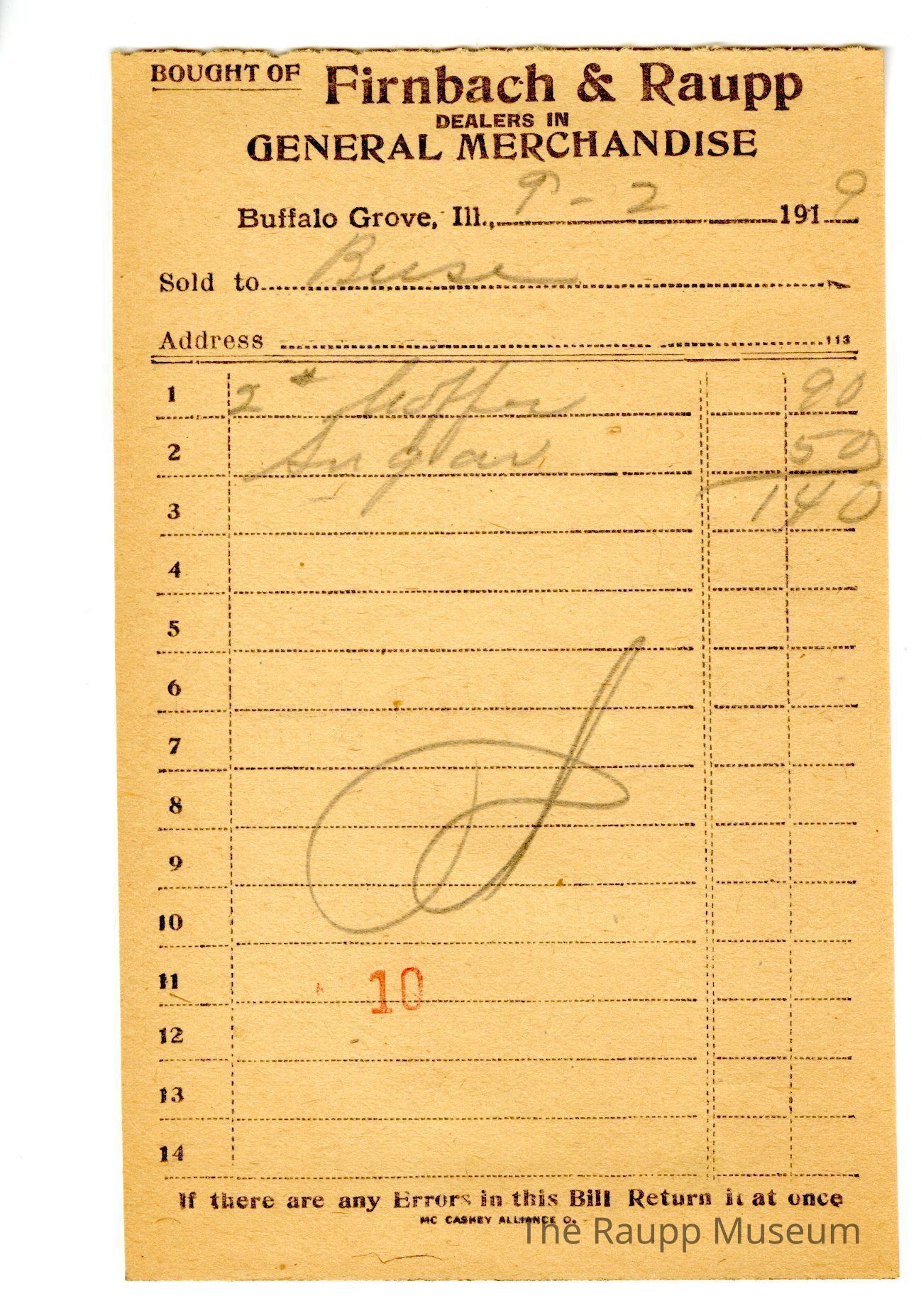 One (1) Firnbach and Raupp store receipt from September 02, 1919. Receipt recipient has the Buse, and has two (2) items purchased (two (2) coffee and one (1) sugar. Buse paid a total of one dollar and forty cents ($1.40). paid one dollar and forty cents ($1.40). Receipt is rectangular, with black printed ink, and written in pencil.The top reads: BOUGHT OF (printed in capital letters and underlined) Firnbach & Raupp; DEALERS IN GENERAL MERCHANDISE (printed in capital letters); Buffalo Grove Ill,.: Sold to; Address. The bottom: If there are any Errors in this Rill Return it at once. The number ten (stamped as 10) is stamped in red near the bottom center of the receipt.Archive Details
