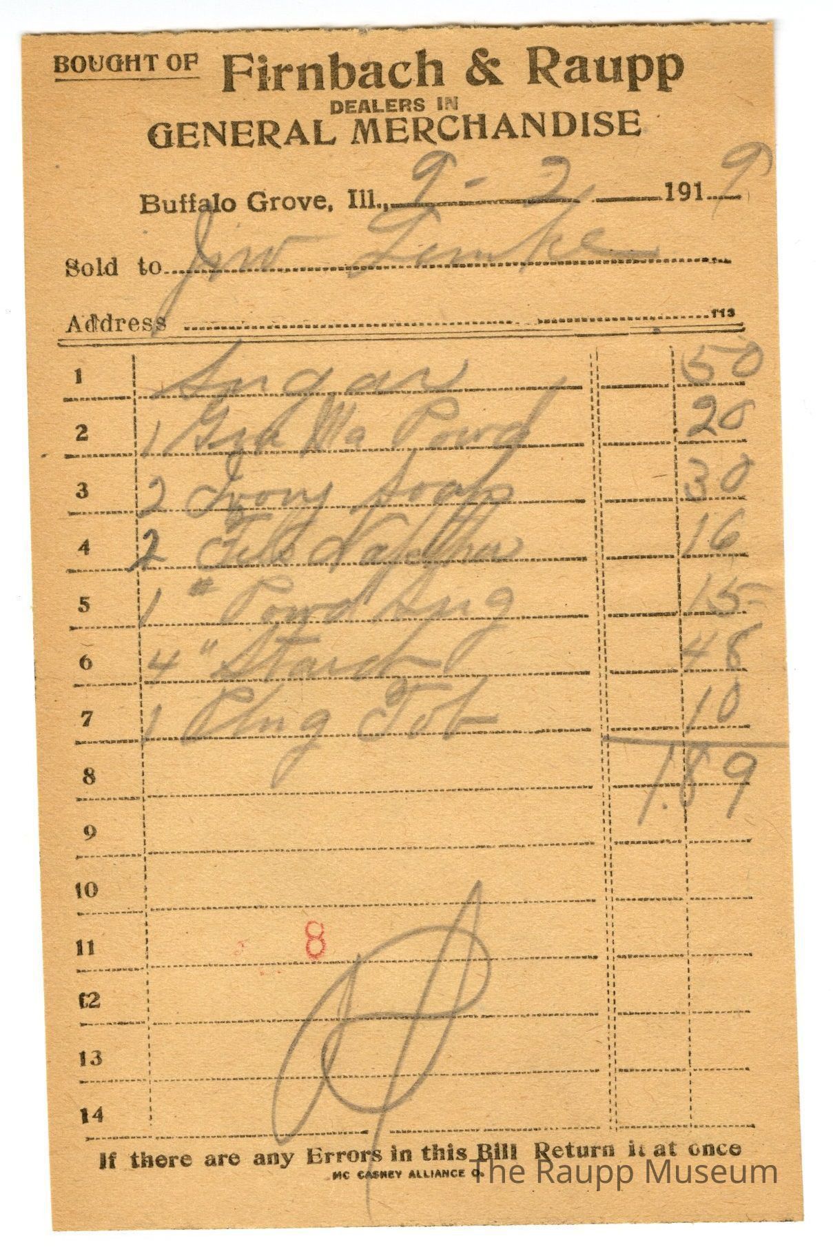 One (1) Firnbach and Raupp store receipt from September 02, 1919. Receipt recipient is Lemke, and has seven (7) items purchased (one (1) sugar, one (1) unknown powder (spelled Powd), two (2) Ivory soap, two (2) unknown item*, one (1) unknown powder (spelled Powd)*, four (4) starch) starch and one (1) unknown Job. Lemke paid a total of one dollar and eight nine cents ($1.89). Receipt is rectangular, with black printed ink, and written in pencil. he top reads: BOUGHT OF (printed in capital letters and underlined) Firnbach & Raupp; DEALERS IN GENERAL MERCHANDISE (printed in capital letters), Buffalo Grove Ill,.: Sold to; Address. The bottom reads: If there are any Errors in this Bill Return it at once.The number eight (stamped as 8) is stamped in red near the bottom center of the reciept.Archive Details