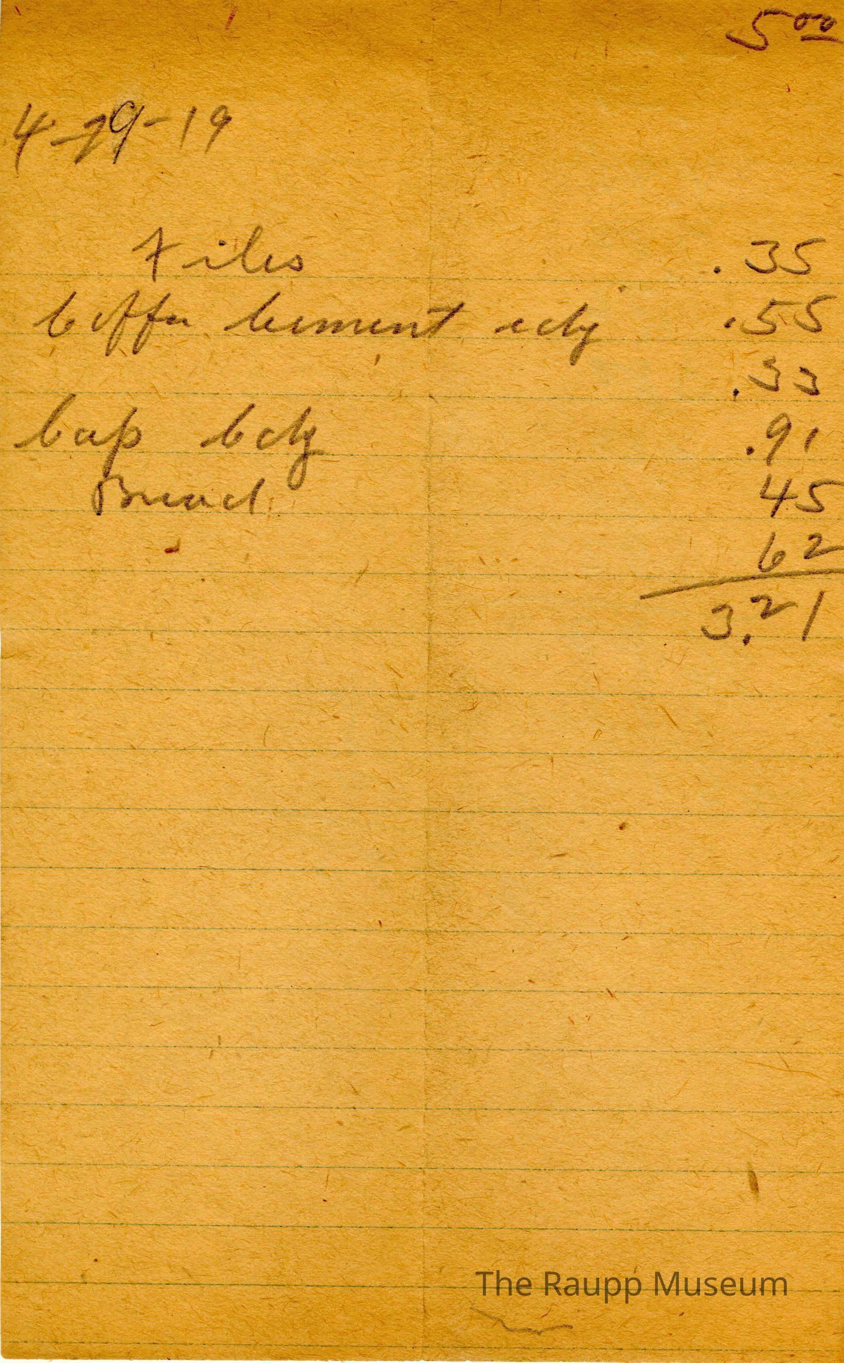 One (1) Firnbach and Raupp store receipt from April 29, 1919. Receipt is for an unknown customer, who bought six items in total. Some purchased items include files (?), coffee, bread, a cap (?), and cement (?) for the total of $3.21. The top right corner is marked with "5.00", possibly the customer's previous credit, as there's no "paid" marking on the bottom. The handwritten parts are in pencil with no print. The receipt is rectangular.Archive Details
