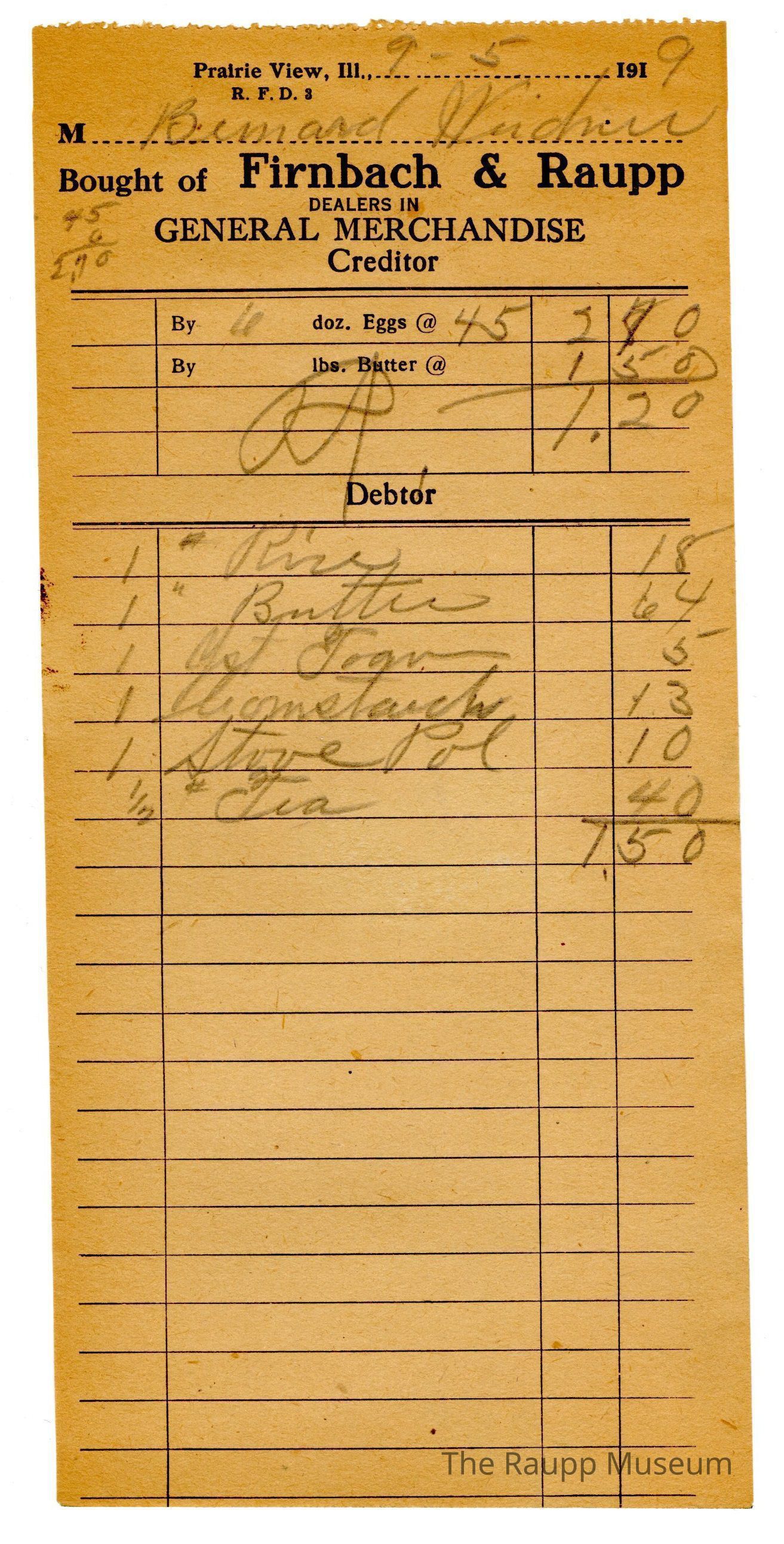 One (1) Firnbach and Raupp store receipt from September 05, 1919. Receipt recipient is Bernard Weidner and has six (6) items purchased (one (1) pound (written as a superscripted pound symbol) rice, one (1) pound (written as a superscripted pound symbol) Butter, one (1) Yeast (written as Yst) Foam, one (1) cornstarch, one (1) stove pot, and one half (1/2) pound (written as a superscripted pound symbol Tea). Bernard Weinder paid seven dollars and fifty cents ($7.50). In addition Bernard Weidner brought in six (6) dozen eggs at forty five cents ($0.45) to earn a credit of two dollars and seventy cents ($2.70), which paid off a one dollar and fifty cents ($1.50) cent debt leaving Bernard Weidner witha one dollar and twenty cent credit ($1.20). Receipt is rectangular, has black ink and written pencil. The top reads: Prairie View, Ill; Bought of Firnbach & Raupp; DEALERS IN; GENERAL MERCHANDISE (printed in capital letters); Creditor, Debtor.Archive Details