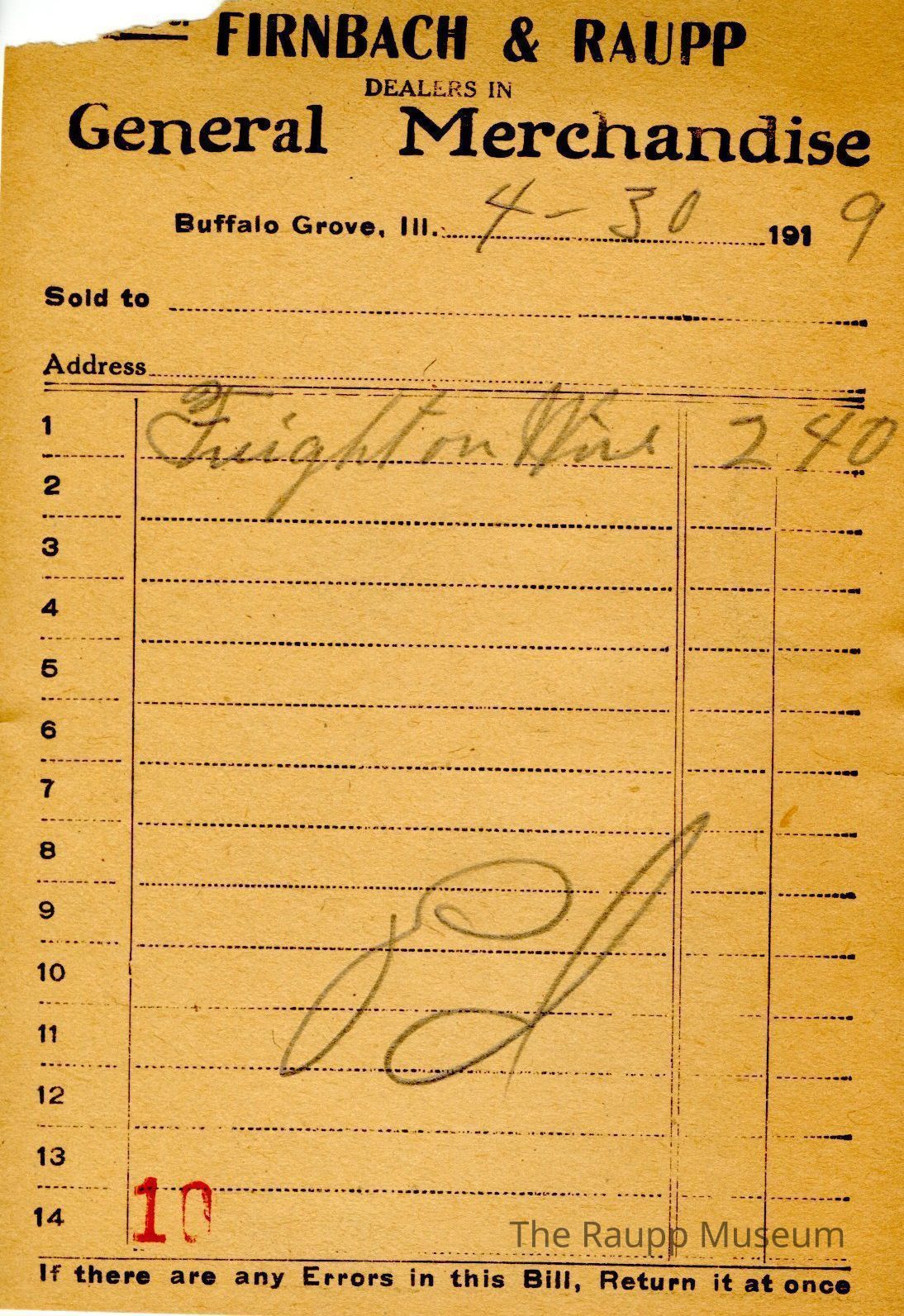 The text printed is as follows, starting from the top: Firnbach & Raupp; Dealers in General Merchandise; Buffalo Grove, Ill.; Sold to; Address; If there are any Errors in this Bill, Return it at onceArchive Details