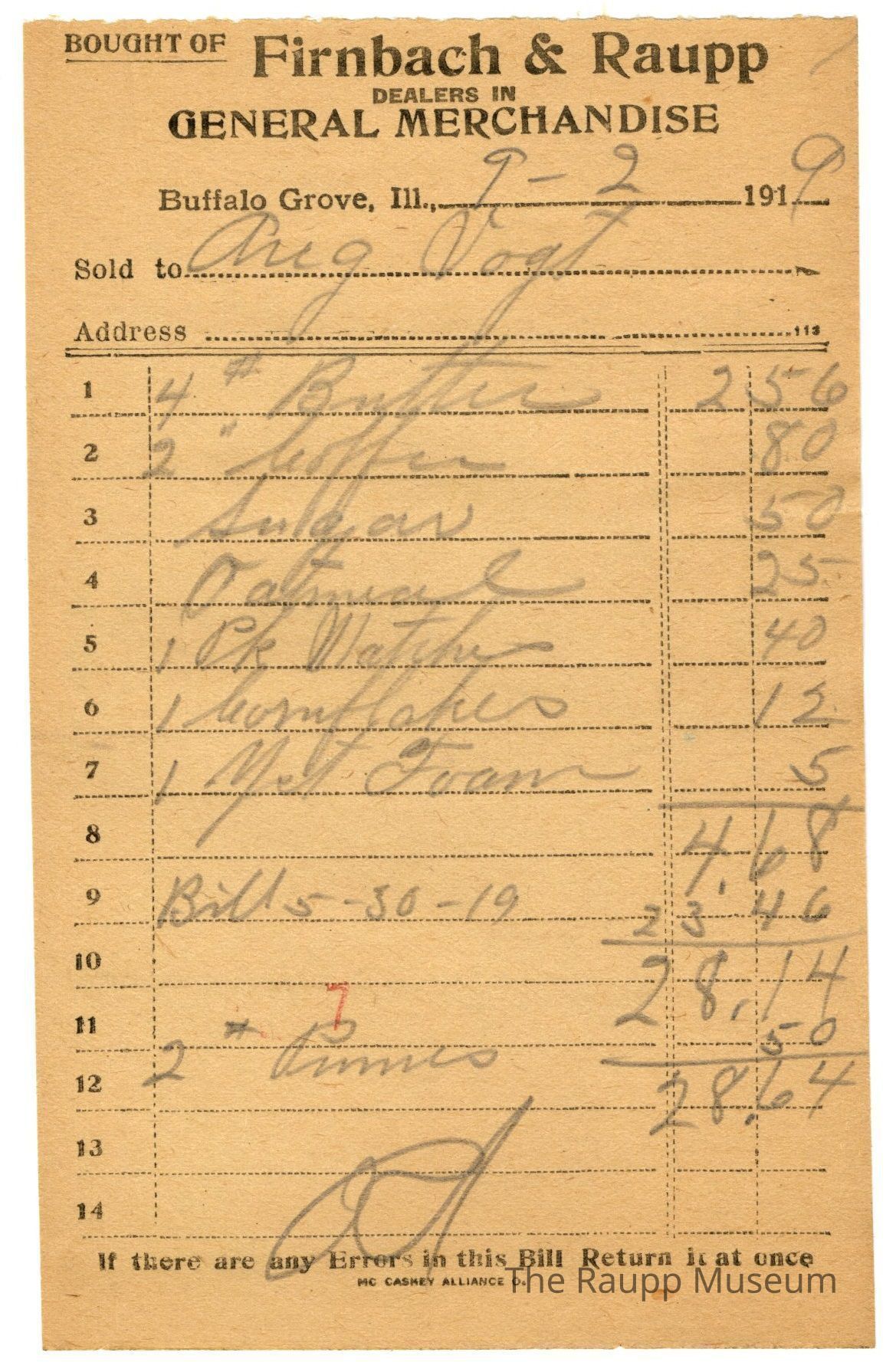 One (1) Firnbach and Raupp store receipt from September 02, 1919. Receipt recipient is Aug Vogt, and has nine (9) items purchased ( four (4) pounds (depicted as a pound symbol superscripted) butter, two (2) coffee, one (1) sugar, one (1) oatmeal, one (1) pack (spelled Pk) Matches (the number 1 is written before Pk), one (1) cornflakes, one (1) yeast (spelled Yst) Foam, one (1) bill from May 30,1919 (written as Bill 5-30-19) and two (2) pounds (depicted as a pound symbol superscripted) prunes). Aug Vogt paid a total of twenty eight dollar and sixty four cents ($28.64). Receipt is rectangular, with black printed ink, and written in pencil. The top reads: BOUGHT OF (printed in capital letters and underlined) Firnbach & Raupp; DEALERS IN GENERAL MERCHANDISE (printed in capital letters), Buffalo Grove Ill,.: Sold to; Address. The bottom reads: If there are any Errors in this Bill Return it at once. The number seven (stamped as 7) is stamped in red near the bottom center of the receipt.Archive Details