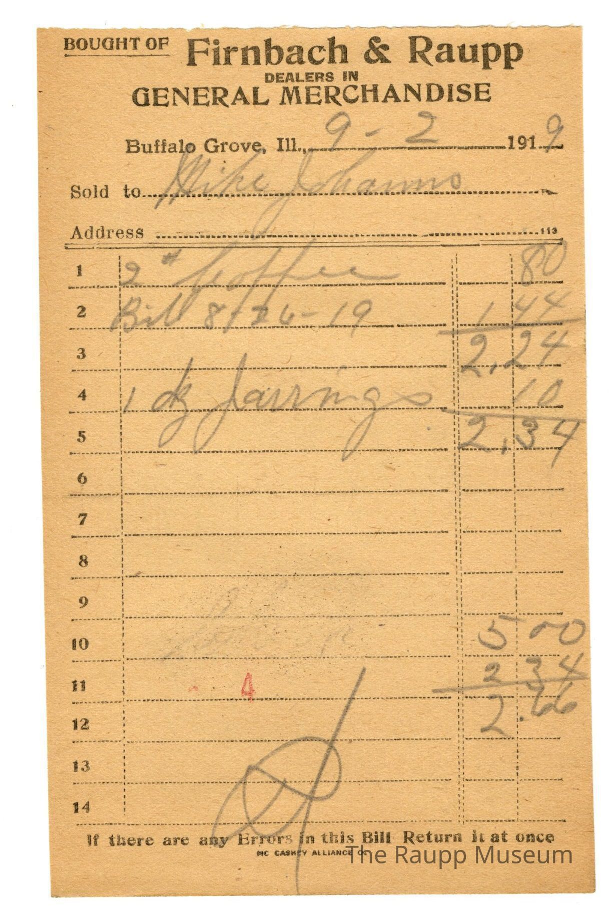 One (1) Firnbach and Raupp store receipt from September 02, 1919. Receipt recipient is Mike J. and has four (4) items purchased (two (2) pounds coffee (the number 2 with the pound sign superscripted is written before coffee), one bill from August 26, 1919 (written as Bill 8-26-19), one (1) dozen (spelled dz) jarrings (prediction: spelling best matches), and one (1) unknown item (unreadible due to being faded)). Mike J. (last name unknown) paid a total of two dollars and sixty six cents ($2.66). Reciept is rectangular, with black printed ink, and written in pencil. The top reads: BOUGHT OF (printed in capital letters and underlined) Firnbach & Raupp; DEALERS IN GENERAL MERCHANDISE (printed in capital letters) , Buffalo Grove Ill,.: Sold to; Address. The bottom reads: If there are any Errors in this Bill Return it at once. The number four (stamped as 4) is stamped in red near the bottom center of the recieptArchive Details