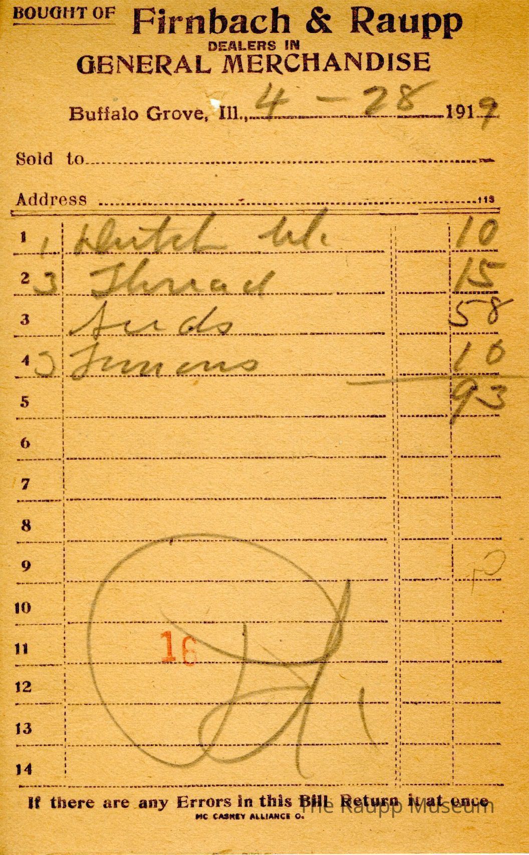 One (1) Firnbach and Raupp store receipt from April 28, 1919. Receipt is for an unknown customer, who bought four items, with the only known purchase being seeds as the other lines are not legible. The bill total is $0.93, with it marked as paid on the bottom. The handwritten parts are in pencil with black printed text throughout. The receipt is rectangular. There is a red 16 stamped on the bottom left corner.