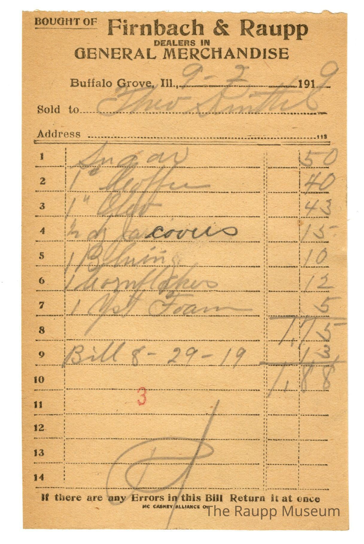 One (1) Firnbach and Raupp store receipt from September 02, 1919. Receipt recipient is Theo S. (last name unknown), and has eight (8) items purchased (one (1) sugar, one (1) pound (written as the pound sign superscripted) coffee, one (1) half dozen (6) (written 1/2 dz) jar covers (prediction best macthes spelling), one (1) unknown object (the number 1 is written before the object), one (1) Cornflakes (prediction based on spelling), one (1) yeast (spelled Yst) Foam (the number 1 is written before the object) and one (1) bill from August 29, 1919 (written as Bill 8-29-19). Theo S. (last name unknown) paid a total of one dollars and eighty eight cents ($1.88). Receipt is rectangular, with black printed ink, and written in pencil. The top reads: BOUGHT OF (printed in capital letters and underlined) Firnbach & Raupp; DEALERS IN GENERAL MERCHANDISE (printed in capital letters), Buffalo Grove Ill,.: Sold to; Address. The bottom reads: If there are any Errors in this Bill Return it at once. The number three (stamped as 3) is stamped in red near the bottom center of the receipt.Archive Details