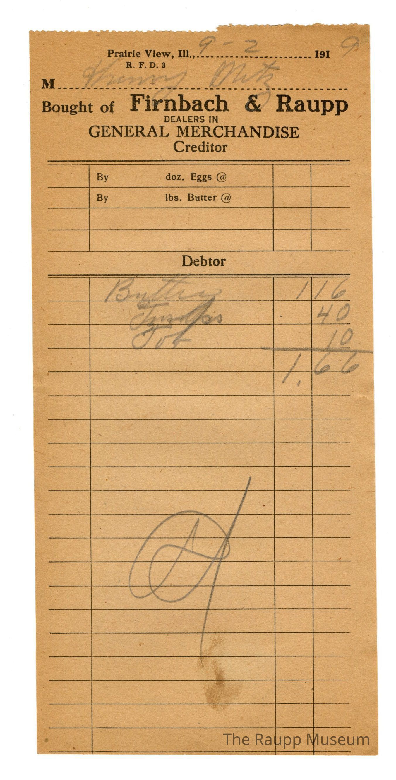 One (1) Firnbach and Raupp store receipt from September 02, 1919. Receipt recipient is for Kimmy Metz, and has three (3) items purchased (one (1) Butter, one (1) unknown product, and one (1) Job. Kimmy Metz's bill was a total of one dollars and sixty six ($1.66). Reciept is rectangular, with black printed ink, and written in pencil. Starting at the top the receipt reads:Praire View, Ill,;M; Bought of Firnbach & Raupp; Dealers in GENERAL MERCHANDISE (printed in capital letters); Creditor; Debtor.Archive Details