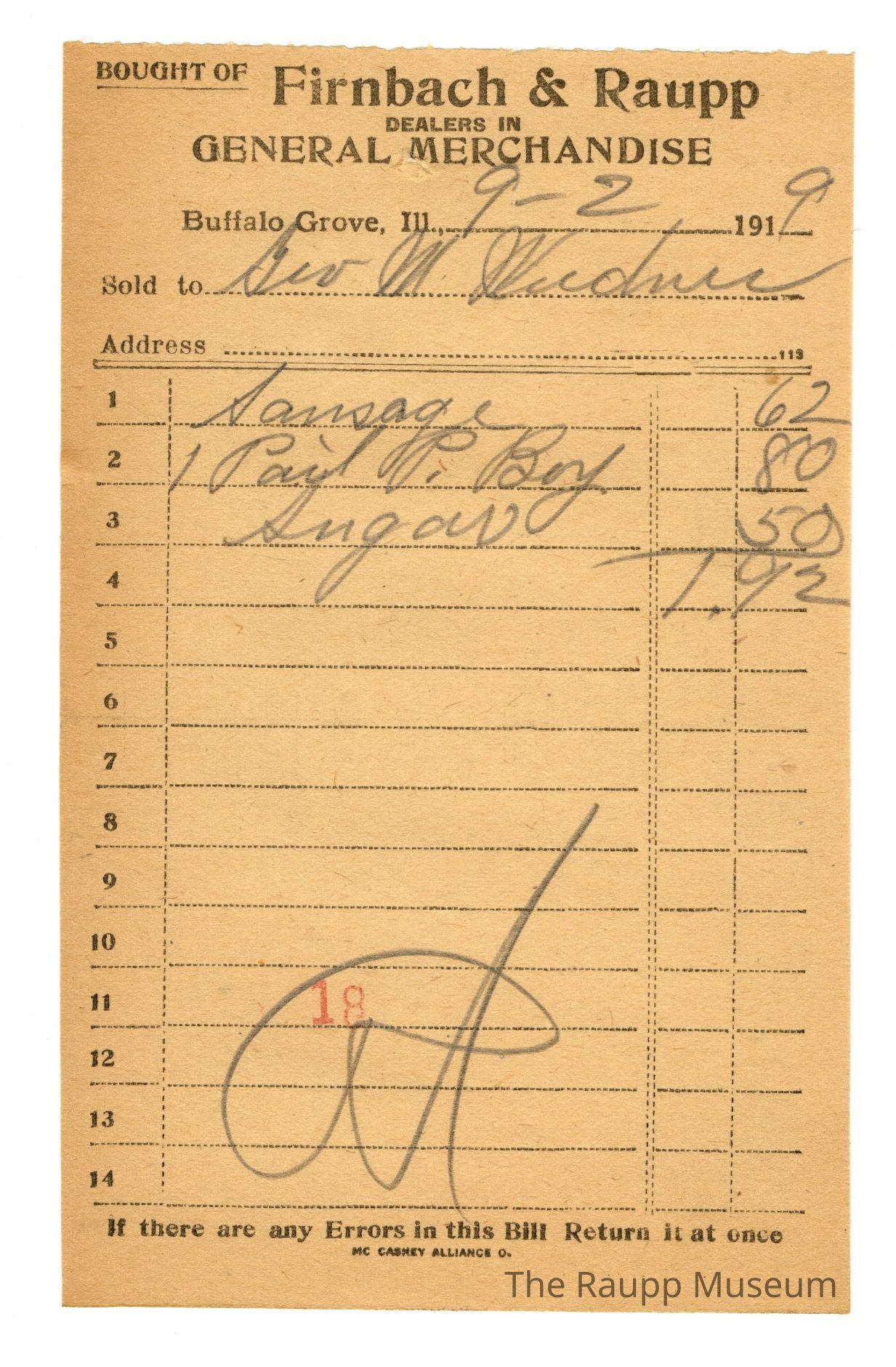 One (1) Firnbach and Raupp store receipt from September 02, 1919. Receipt recipient is George Martin (spelled Geo M. on the recipet) Weidner, and has three (3) items purchased (one (1) sausage, one (1) unknown Pail, and one (1) sugar). Geo M. Weidner paid one dollar and ninety two cents ($1.92). Receipt is rectangular, with black printed ink, and written in pencil. The top reads: Bought of Firnbach & Raupp;DEALERS IN GENERAL MERCHANDISE (printed in capital letters); Buffalo Grove, Ill,: Sold to; Address. The bottom reads: If there are any Errors in this Bill Return it at once. The number eighteen (stamped 18) is stamped in red in the bottom middle of the page.Archive Details