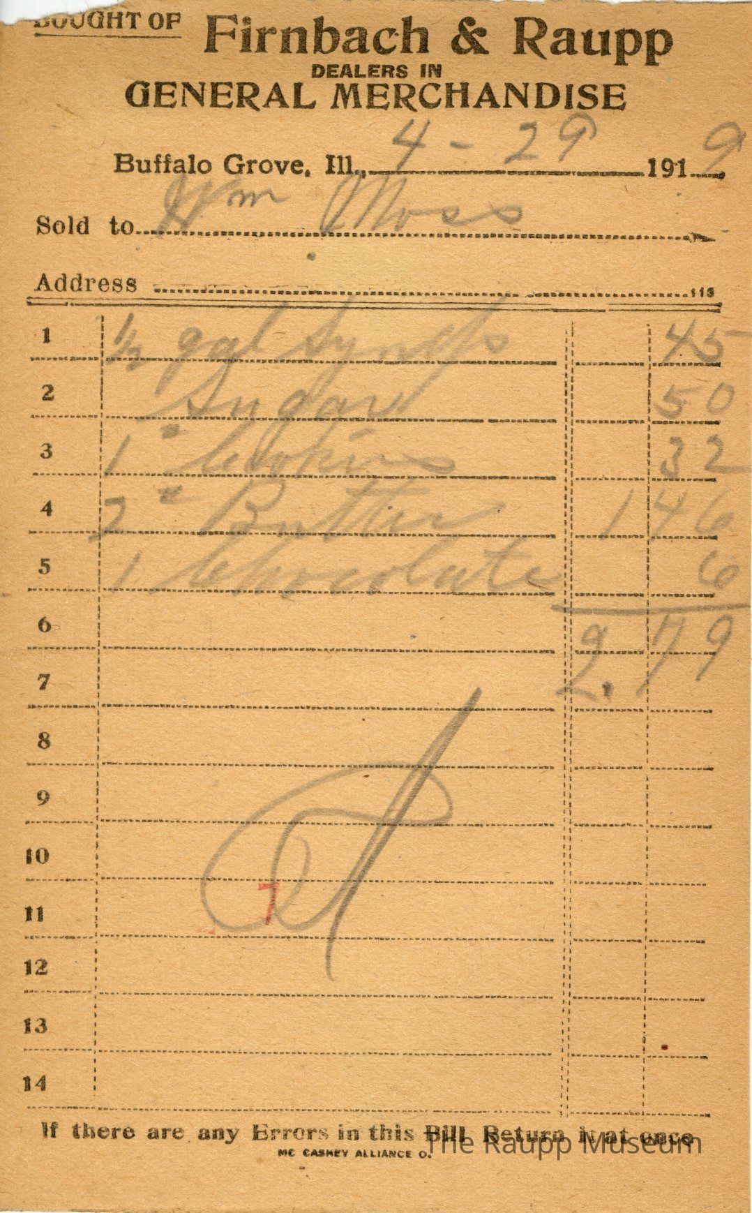 The black text is as follows, from top to bottom: Bought of Firnbach & Raupp; Dealers in GENERAL MERCHANDISE; Buffalo Grove, Ill.; Sold to; Address; If there are any Errors in this Bill Return it at once; MC CASKEY ALLIANCE O.Archive Details