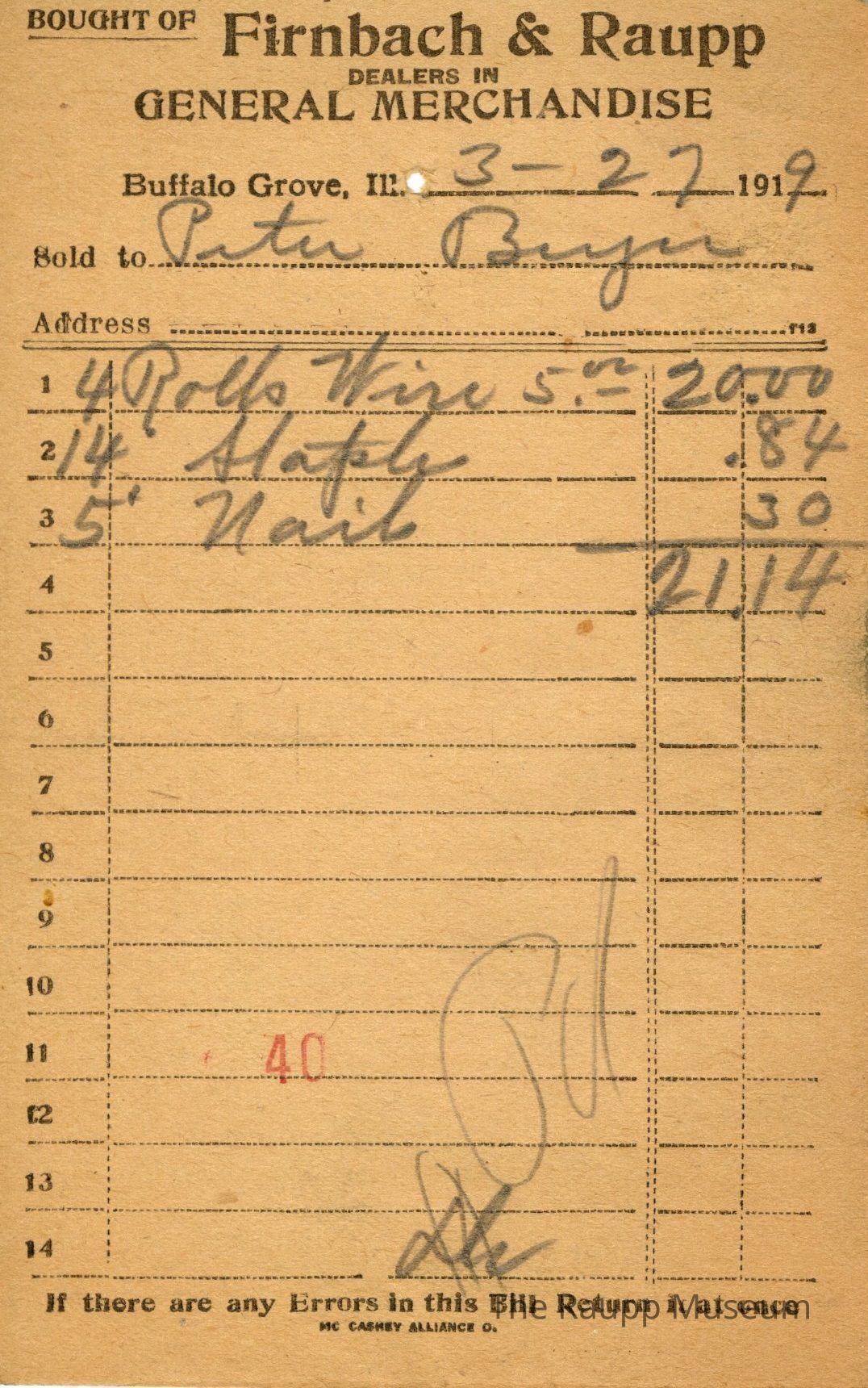 The black text is as follows, from top to bottom: Bought of Firnbach & Raupp; Dealers in GENERAL MERCHANDISE; Buffalo Grove, Ill.; Sold to; Address; If there are any Errors in this Bill Return it at once; MC CASKEY ALLIANCE O.Archive Details