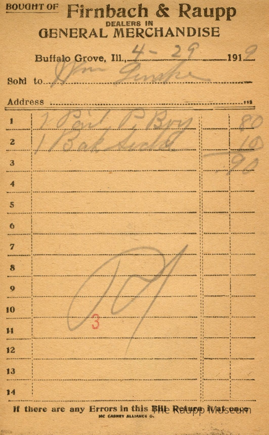 The black text is as follows, from top to bottom: Bought of Firnbach & Raupp; Dealers in GENERAL MERCHANDISE; Buffalo Grove, Ill.; Sold to; Address; If there are any Errors in this Bill Return it at once; MC CASKEY ALLIANCE O.Archive Details
