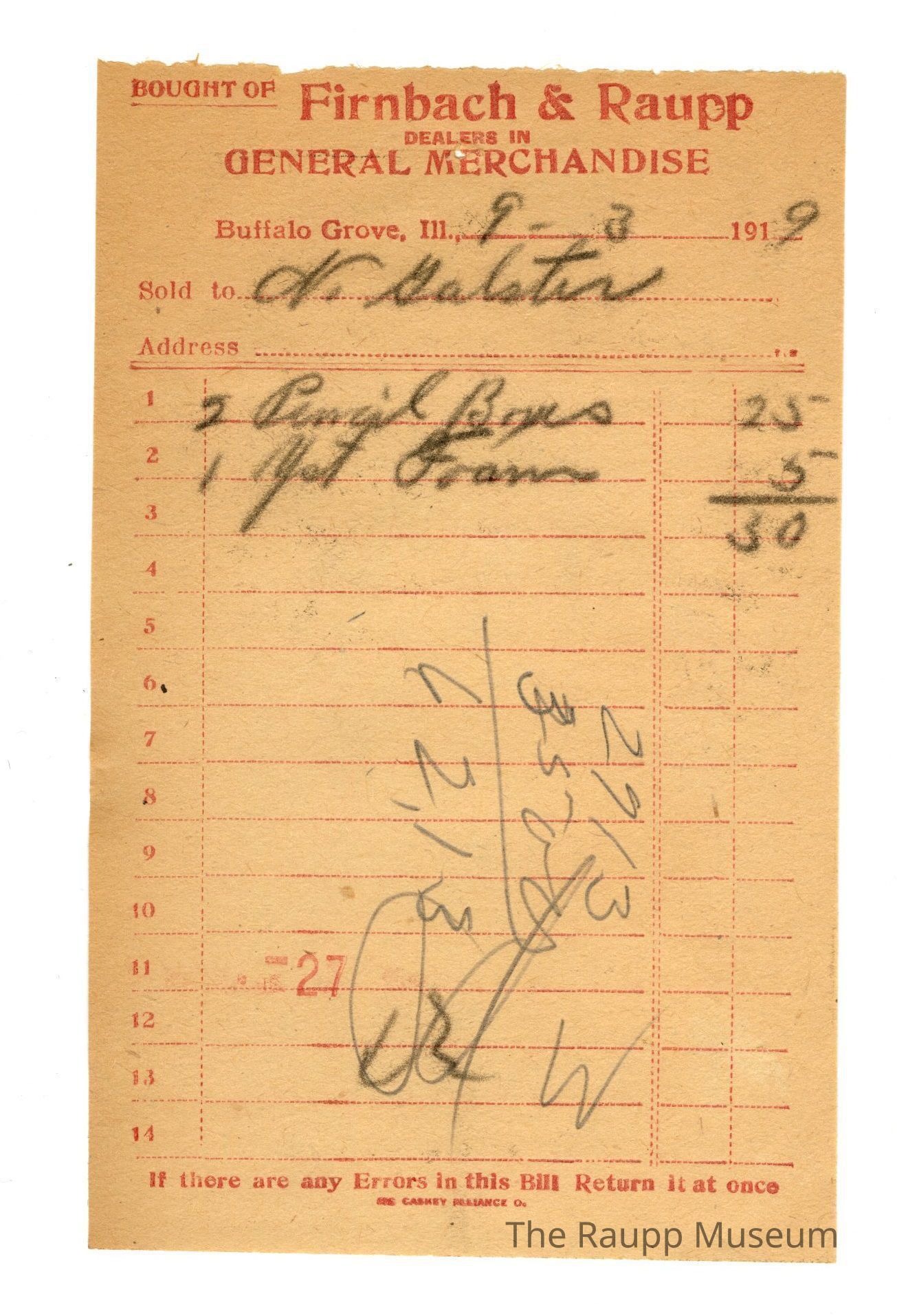 One (1) Firnbach and Raupp store receipt from September 03, 1919. Receipt recipient is N. Galster and has two (2) items purchased (two (2) pencil boxes and one (1) Yeast (written as Yst) Foam. N. Galster paid thrity cents ($0.30). Receipt is rectangular, with red printed ink, and written in pencil. The top reads: BOUGHT OF (written in all capitals and underlined) Firnbach & Raupp; Dealers in GENERAL MERHCANDISE (written in all capitals); Buffalo Grove, Ill,: Sold to; Address. The bottom reads: If there are any Errors in this Bill Return it at once. The number twenty seven (stamped as 27) is stamped in red in the bottom middle of the page, some of the red ink is smudged.Archive Details