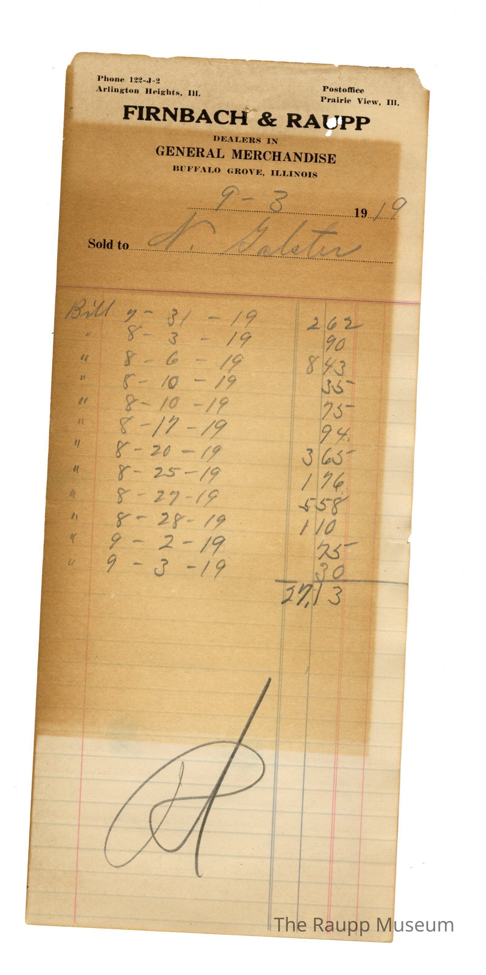 One (1) Firnbach and Raupp store receipt from September 03, 1919. Receipt recipient is for N. Galster and has twelve (12) bills listed (4-31-19, 8-3-19, 8-6-19, 8-10-19, 8-10-19, 8-17-19, 8-20-19, 8-25-19, 8-27-19, 8-28-19, 9-2-19, 9-3-19). N. Galster paid twenty seven dollars and thirteen cents ($27.13). Reciept is rectangular, with black, red and blue printed ink, and written in pencil. The top left corner reads: Phone 122-J-2; Arlington Heights, Ill. The top right corner reads: Post office; Prairie View, Ill. The top of teh reciept reads: Firnbach and Raupp; DEALERS IN; GENERAL MERCHANDISE, BUFFALO GROVE, ILLINOIS (printed in capital letters); Sold to.Archive Details