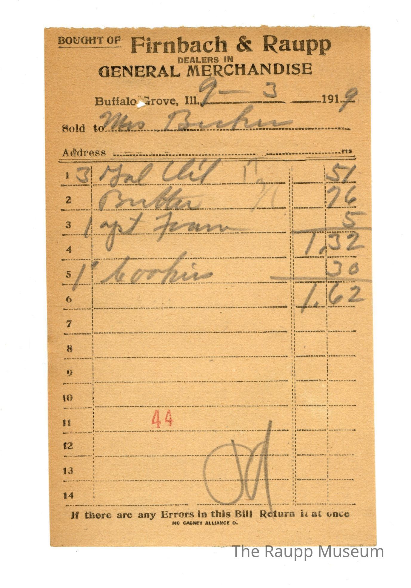 One (1) Firnbach and Raupp store receipt from September 03, 1919. Receipt recipient is for Mrs. Becker and has four (4) items purchased (three (3) gallons (written gal) oil, one (1) butter, one (1) Yeast (spelled Yst) Foam, and one (1) cookie. Mrs. Becker paid one dollar and sixty two cents ($1.62). Receipt is rectangular, with black printed ink, and written in pencil. The top reads: BOUGHT OF (printed in capital letters and underlined); Firnbach and Raupp; DEALERS IN; GENERAL MERCHANDISE (printed in capital letters); Buffalo Grove, Ill; Sold to; Address. The bottom reads: If there are any Errors in this Bill Return it at once. The number forty four (stamped as 44) is stamped in red in the bottom middle of the page.Archive Details