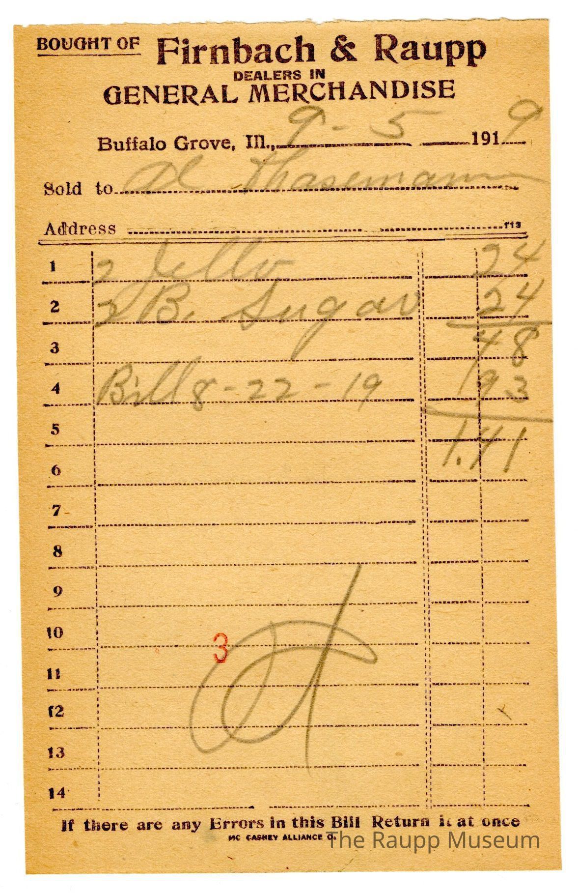 One (1) Firnbach and Raupp store receipt from September 05, 1919. Receipt recipient is Al Hasemann and has three (3) items purchased (two (2) jello, two (2) Brown (spelled B.) sugar, and one (1) bill from August 22, 1919 (written as 8-14-19)). Al Hasemann paid one dollar and forty one cents ($1.41). Receipt is rectangular, has black ink and written pencil. The top reads: Prairie View, Ill; BOUGHT OF (underlined and printed in capital letters); Firnbach & Raupp; DEALERS IN; GENERAL MERCHANDISE (printed in capital letters); Buffalo Grove Ill; Sold to; Address. The bottom reads: If there are any Errors in this Bill Return it at once. The number three (stamped as 3) is stamped in red ink at the bottom center of the page.Archive Details