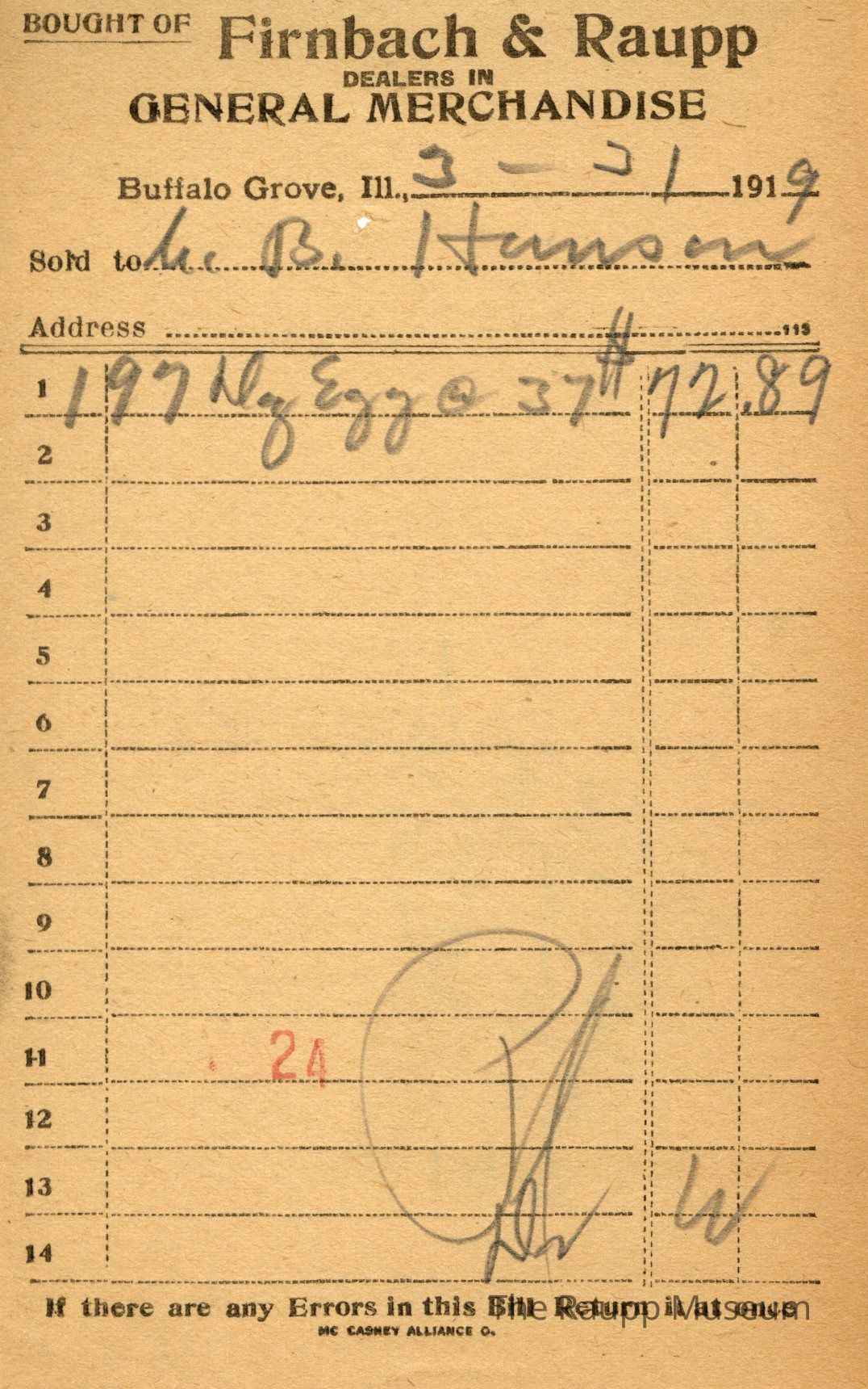 One (1) Firnbach and Raupp store receipt from March 31, 1919. Receipt is rectangular with black printed text and written notes in pencil. The receipt is for C.B. Hanson, who bought one hundred ninety-seven (197) dozens of eggs at the unit price of $0.37 per dozen. Bill total is $72.89. There's a red stamp of 24 close to the bottom, with the bill marked as paid.