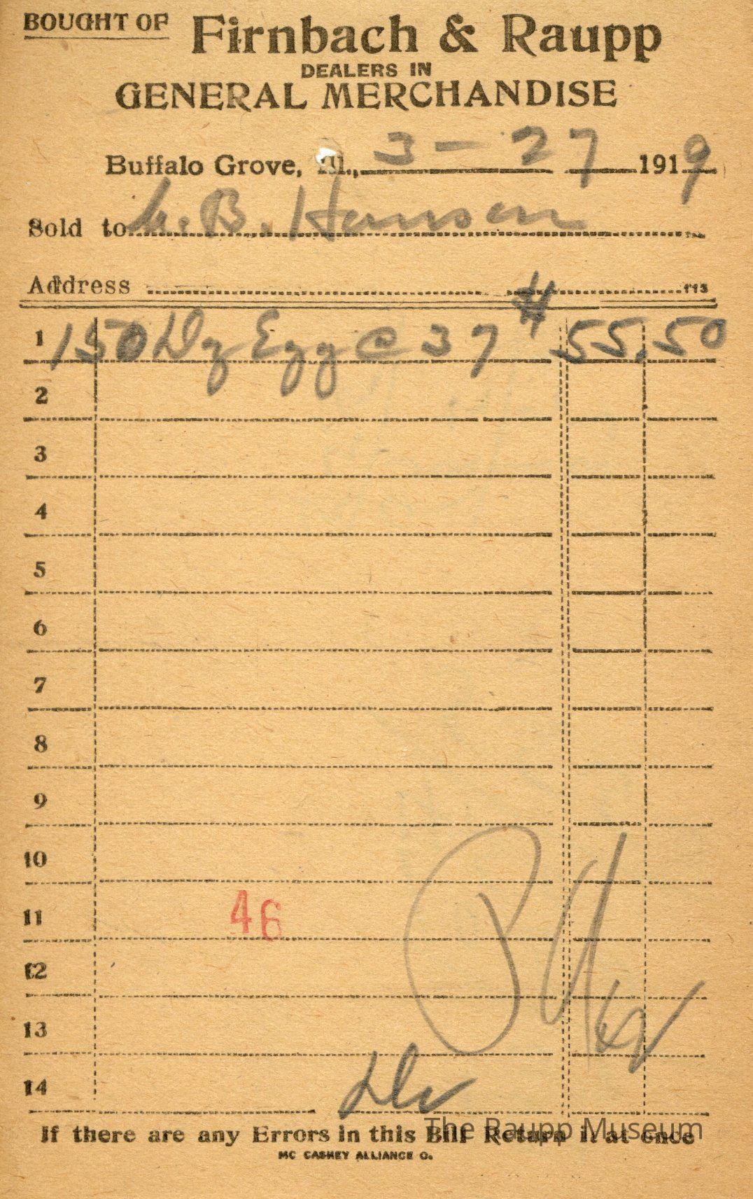 One (1) Firnbach and Raupp store receipt from March 27, 1919. Receipt is rectangular with black printed text and written notes in pencil. The receipt is for C.B. Hanson, who bought one hundred and fifty (150) dozens of eggs at the unit price of $0.37 per dozen. Bill total is $55.50. There's a red stamp of 46 close to the bottom, with the bill marked as paid.