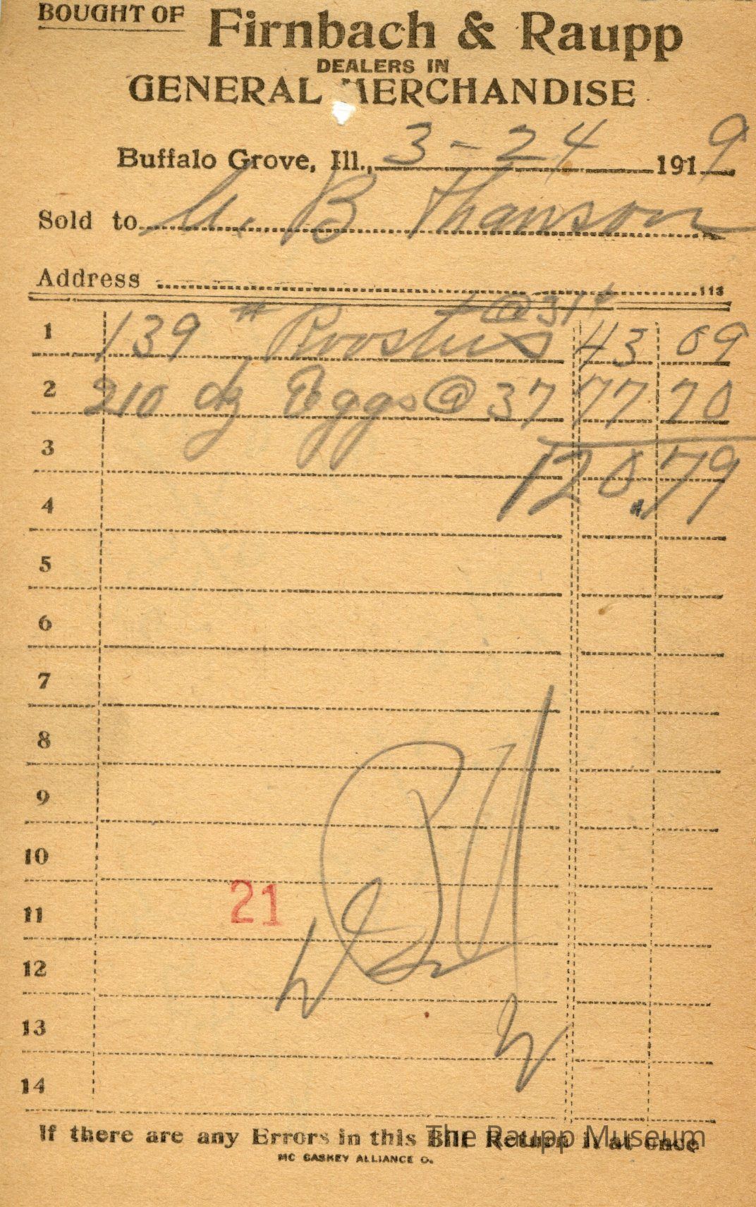 One (1) Firnbach and Raupp store receipt from March 24, 1919. Receipt is rectangular with black printed text and written notes in pencil. The receipt is for C.B. Hanson, who bought two hundred and ten (210) dozens of eggs at the unit price of $0.37 per dozen, and one hundred thirty-nine (139) pounds of roosters at the unit price of $0.31 per pound. Bill total is $120.79. There's a red stamp of 21 close to the bottom, with the bill marked as paid.