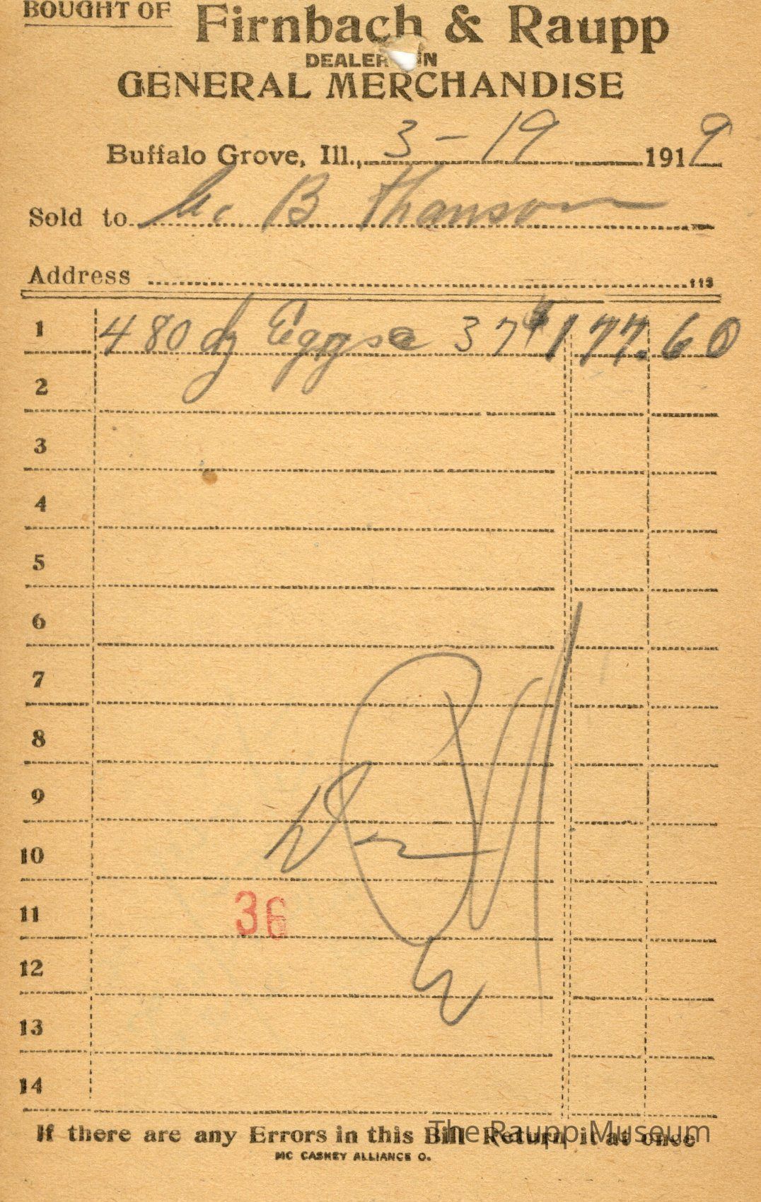 One (1) Firnbach and Raupp store receipt from March 19, 1919. Receipt is rectangular with black printed text and written notes in pencil. The receipt is for C.B. Hanson, who bought four hundred and eighty (480) dozens of eggs at the unit price of $0.37 per dozen. Bill total is $177.60. There's a red stamp of 36 close to the bottom, with the bill marked as paid.