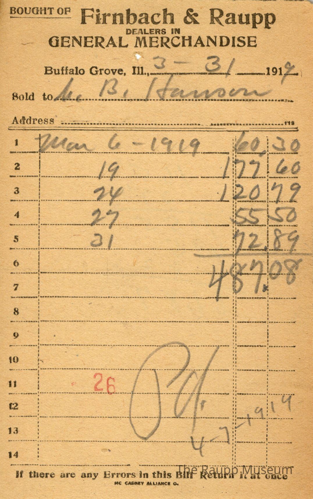 One (1) Firnbach and Raupp store receipt from March 31, 1919. Receipt is rectangular with black printed text and written notes in pencil. The receipt is for C.B. Hanson, appearing as if it's the summary of the customer's purchases in the month of March. Bill total is $487.08. There's a red stamp of 26 close to the bottom, with the bill marked as paid.