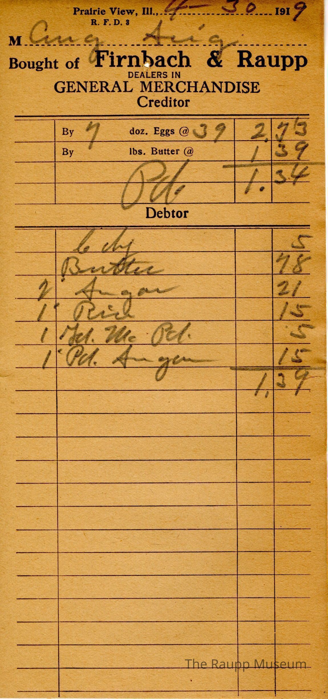 One (1) Firnbach and Raupp store reciept from April 30, 1919. Reciept is for C. A. (?), and has 6 items purchased. The buyer brought in 7 dozens of eggs at $0.39 per dozen for the total of $2.73. while they purchased items for a total of $1.39, with the store returning $1.34 at the conclusion. Some items bought include butter, sugar, rice (?), and augar.