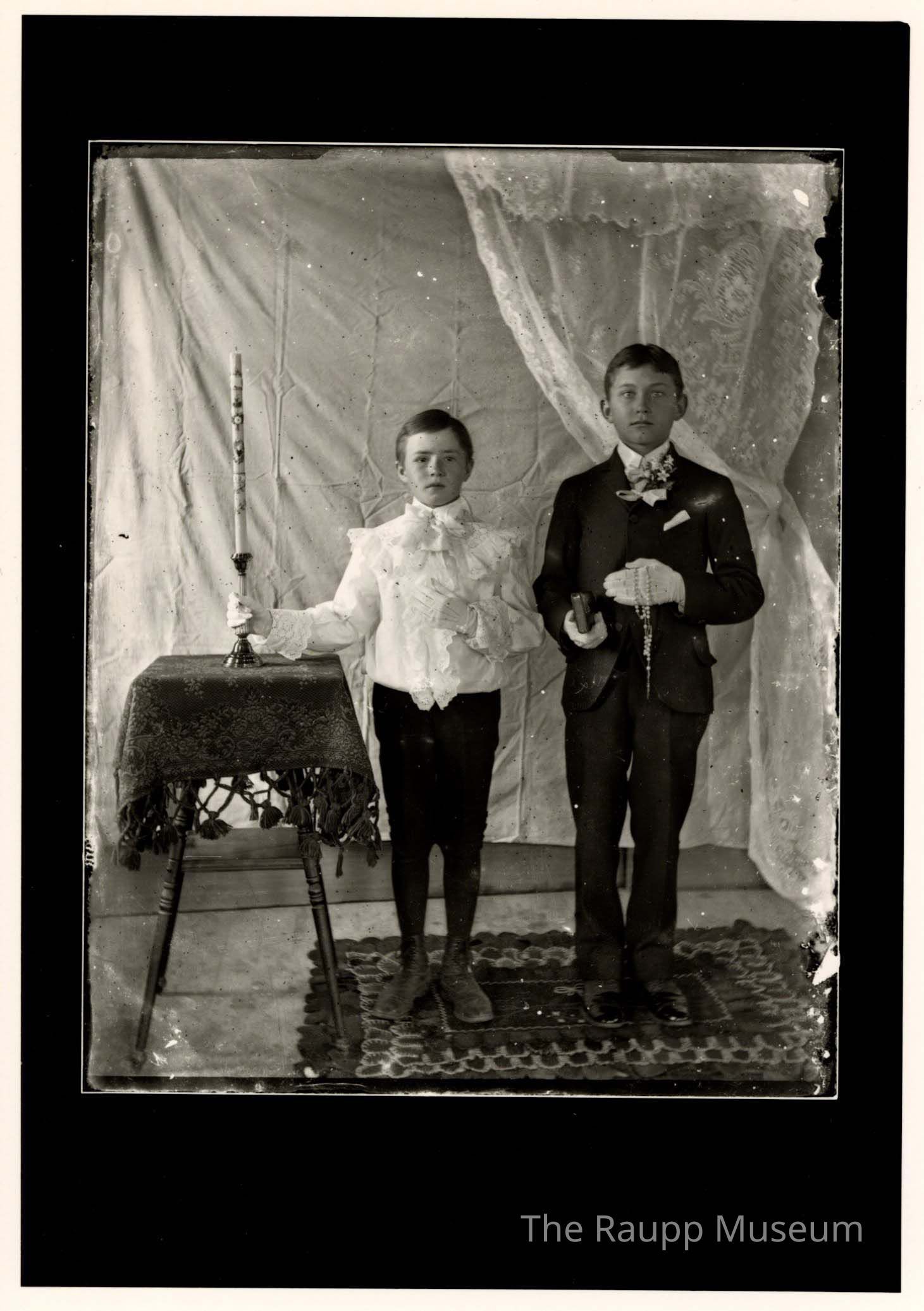 One (1) black and white photo taken from a glass negative. Photo shows 2 young boys standing to left of a table. Table has a cloth and candle. Boy in white shirt has his right hand on the candle base. Boy in black suit has a bible in right hand and rosary in left hand. They are standing on a square rug.