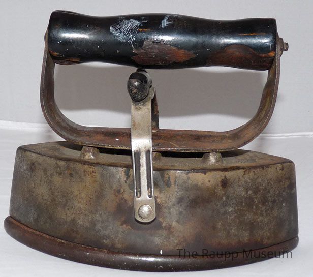 Metal flatiron with wood handle and case with detachable cast iron base. Base has a textured eliptical shape and embossed text: "Asbestos sad iron." Metal bar attaches the base and the handle case. Over all, rusty and handle is chipped.Dimensions