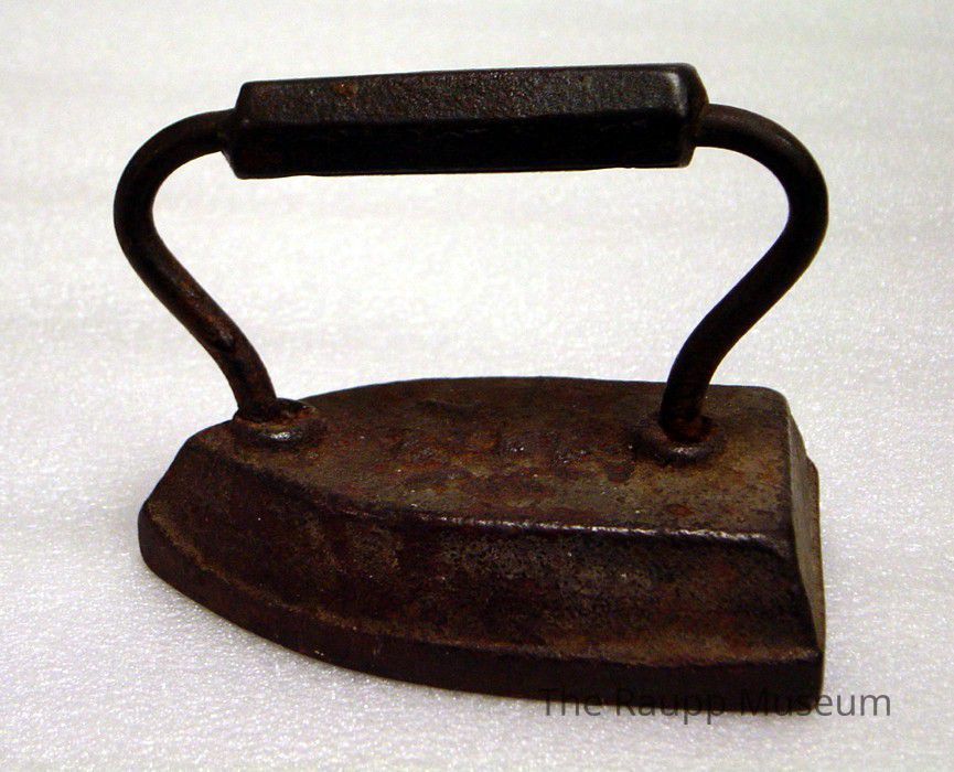 One (1) black cast iron flat iron, used for ironing clothes. Flat part tombstone-shaped, attached to a handle, widened in the middle for holding on.Dimensions