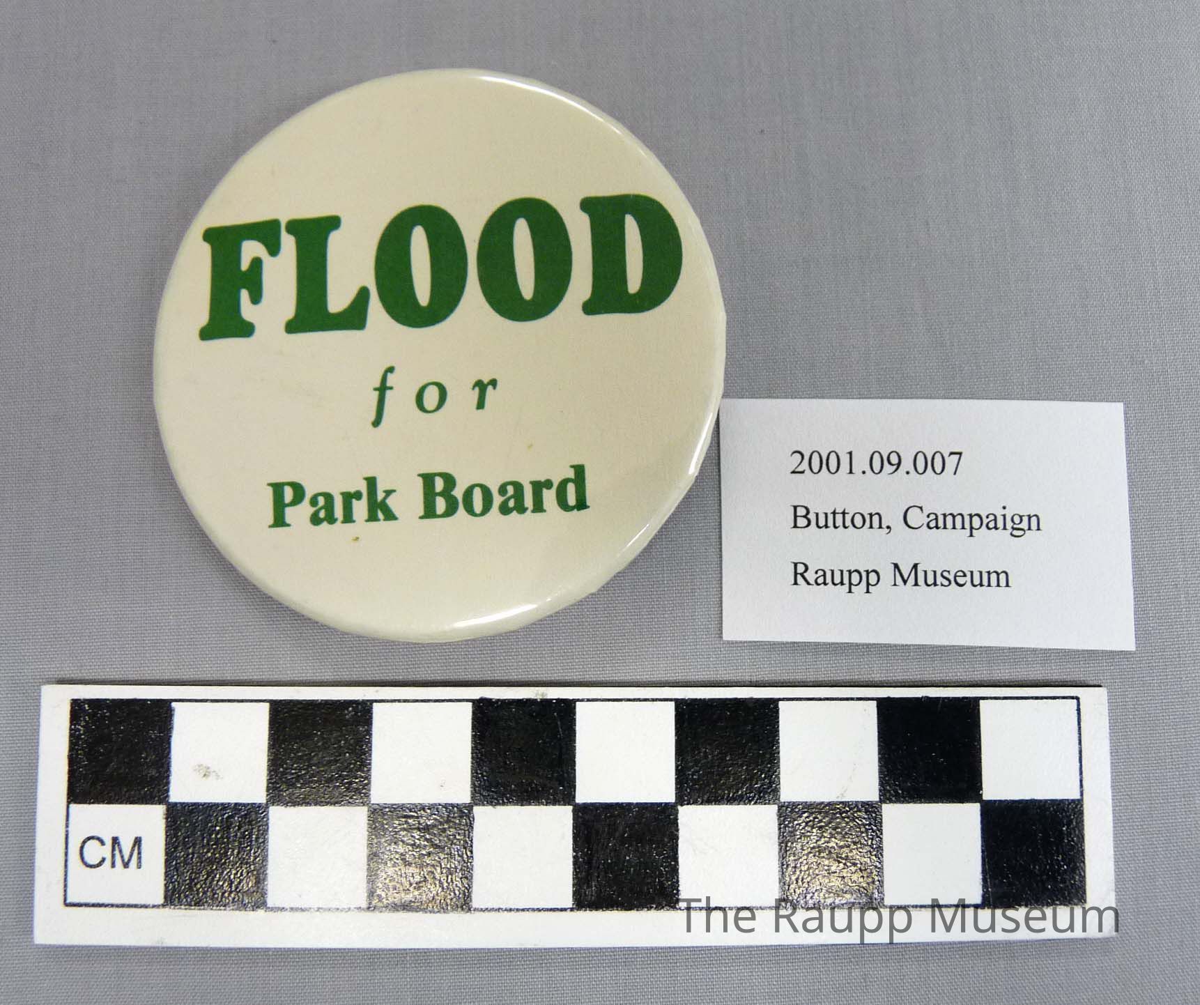 One (1) round metal political button, with a white background and green text that reads: "Flood for Park Board". The back is silver with a stamp "Bade - A- Minit" etched into it. There is safety pin attachment on the back.Material