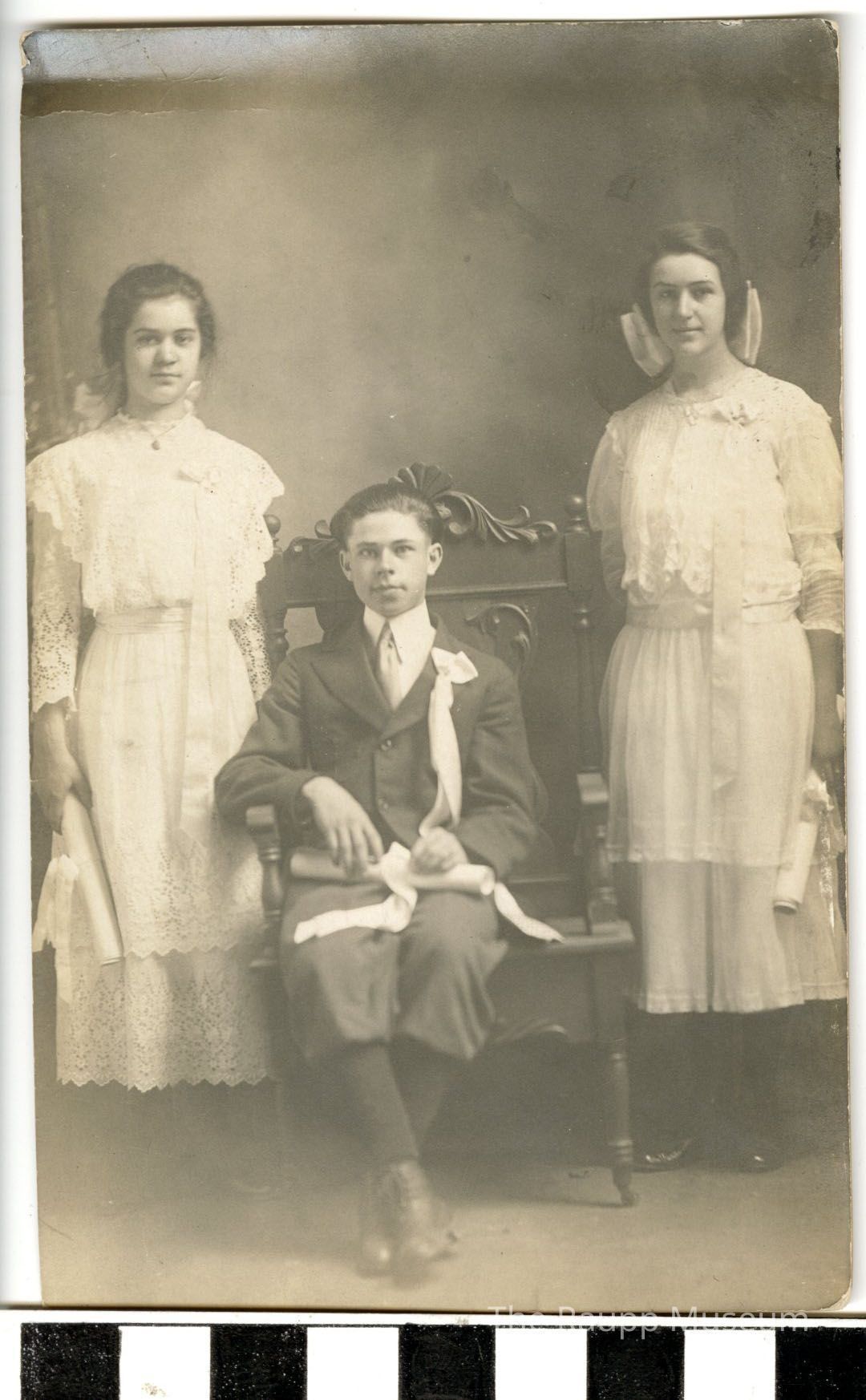 One (1) picture postcard. Picture on front is black and white, and features three people: a young man seated, and a girl on either side of him. The girl on the left (mans' right) is Florence Weidner. The girls are wearing white lace dresses with white sashes and a white bow pined on their left side. They have on white bows in their hair and black boots. They are holding their St. Mary's diplomas in their hands - the girl on the left has her diploma in her right hand, the girl on the right in her left hand. The man is seated in a dark wooden chair with a two piece suit on, a black coat and white undershirt with white tie. He has on the same white bow on his left lapel and has his diploma on his lap.