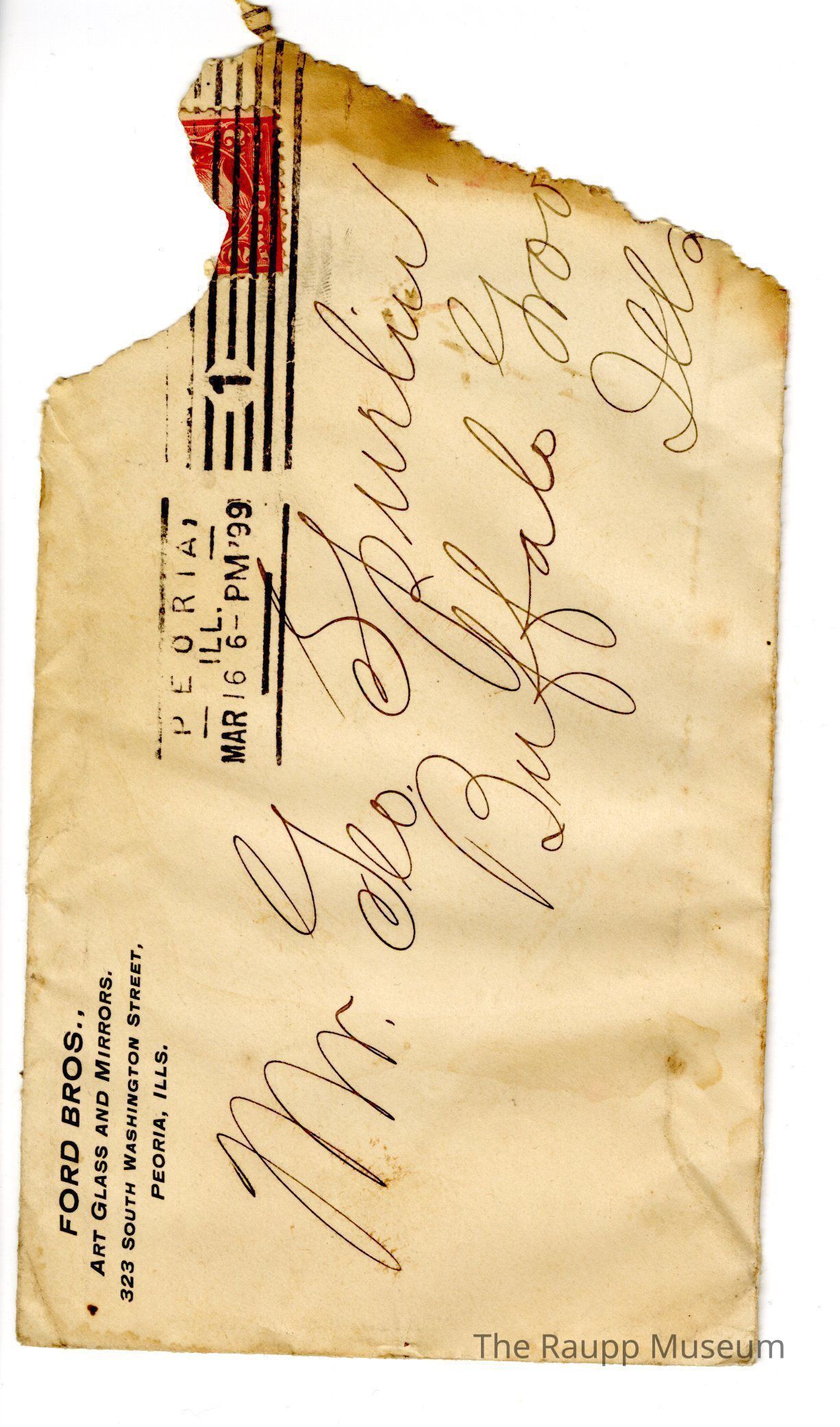 One (1) handwritten envelope from Ford Bros. Co. to Mr. Geo. Spurlin. Envelope is for letter (2020.01.052A). The right 1/3 of envelope is missing. The return address is printed in top left: "Ford Bros., Art Glass and Mirrors. 323 South Washington Street. Peoria, ILLS." Handwritten address in center: Mr. Geo. Spurlin. Buffalo Grov...Ills." It is stamped in the center with "Peoria, ILL. Mar 16 6-PM'99" There is a red two cent stamp in the right corner. On the back is a stamp for Buffalo Grove March 8 1899, and some handwritten math.Archive Details