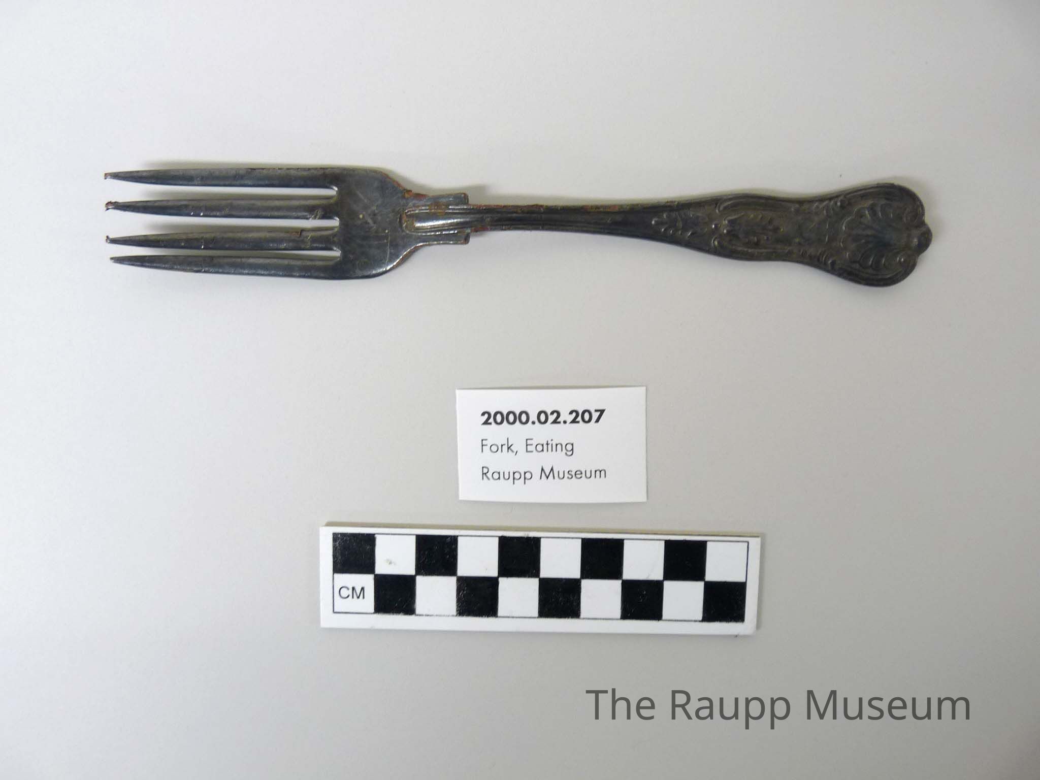 One (1) metal (silver?) fork with 4 tines. "USN" is stamped on the back of the handle, with a scroll design.