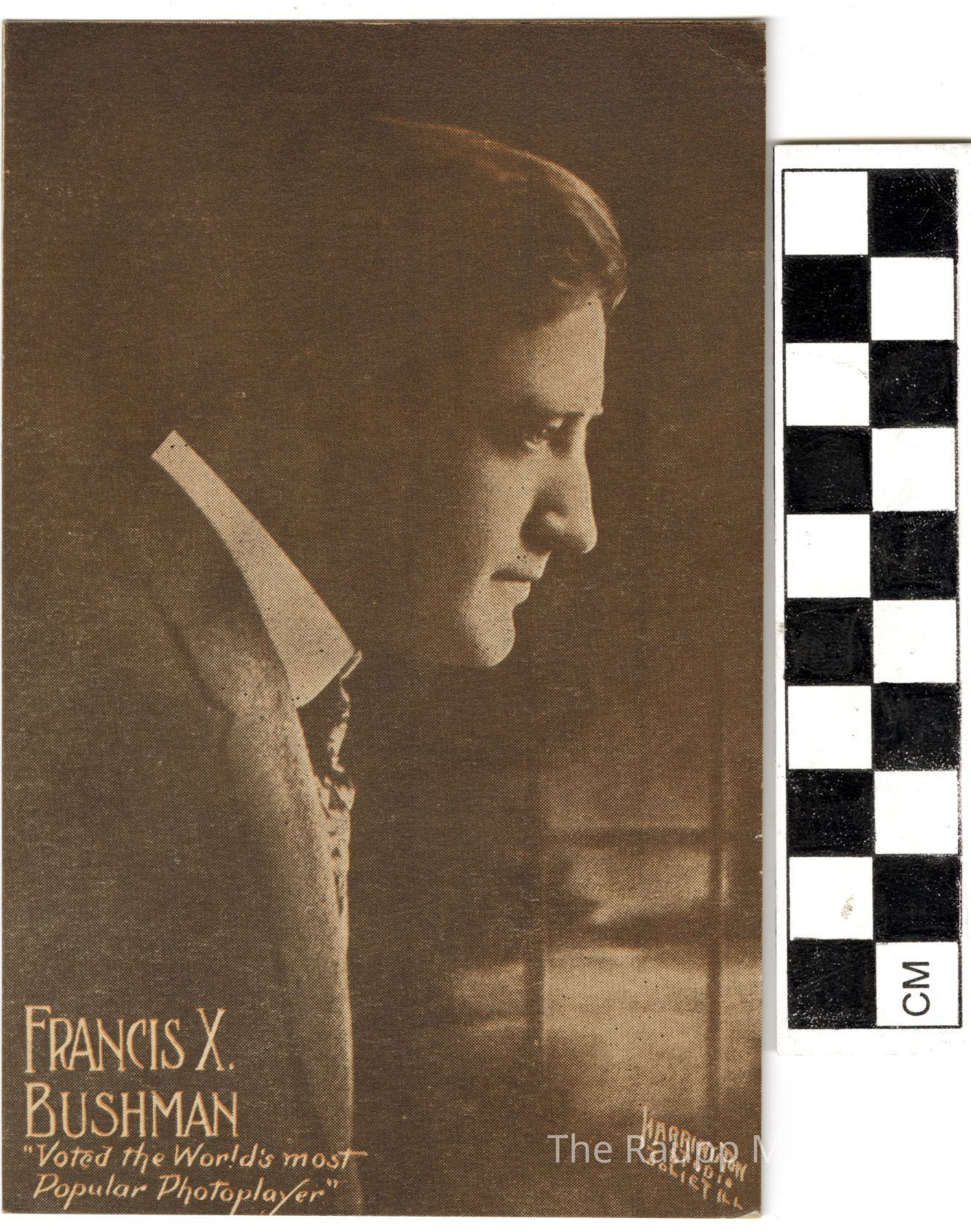 One (1) beige, black and white paper postcard advertisement. The front has a profile sepia toned picture of a man from the waist up, wearing a dark suit with white undershirt and tie. The photo shows his right side. On the bottom in white print is: "Francis X. Bushman, "Voted the World's most Popular Photoplayer", Harrington Studio Joliet ILL".