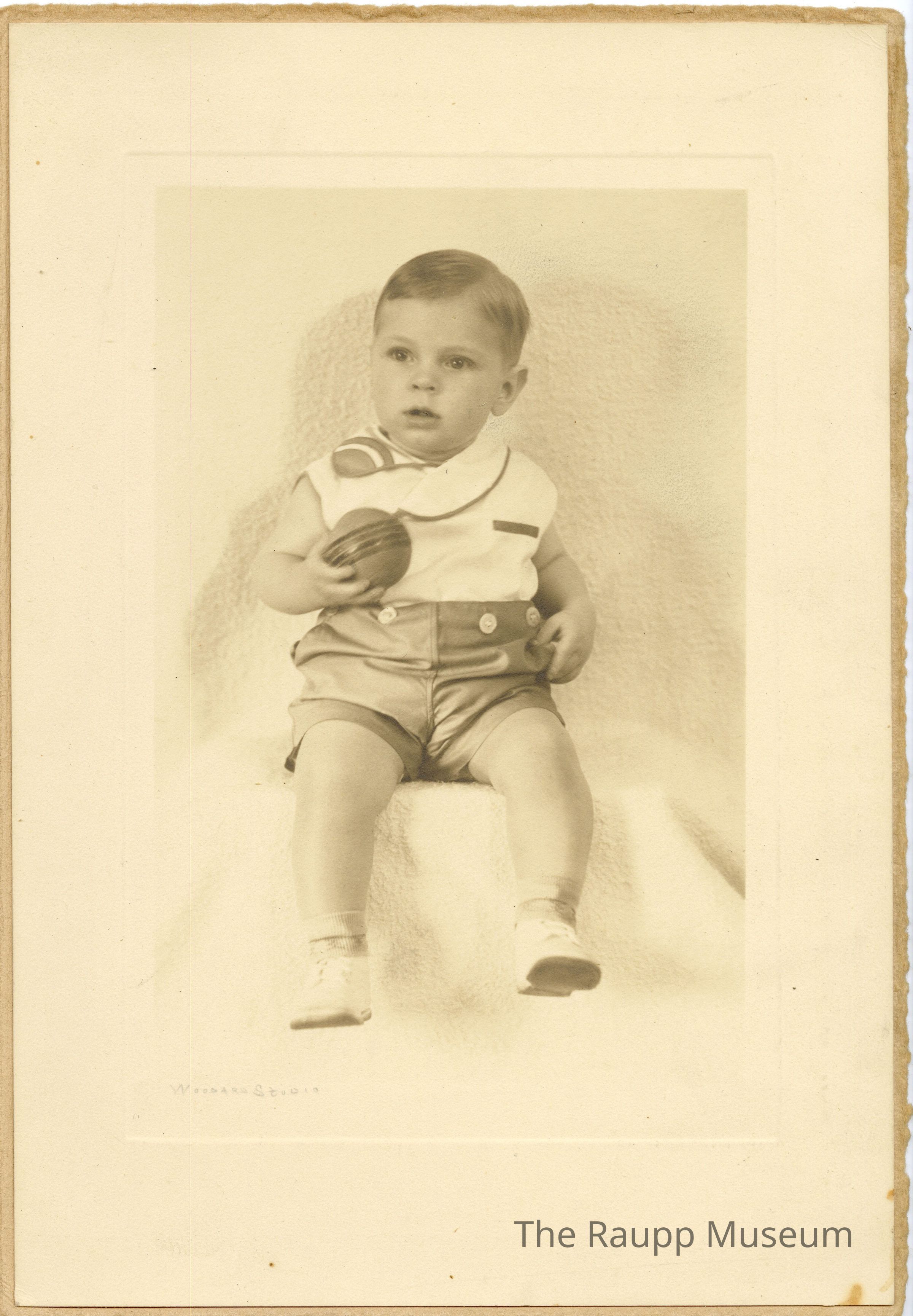One (1) black and white sepia toned photograph of a baby. The baby is seated with a white shirt with brown outlines, and dark colored shorts. He has little white shoes on. He is holding a ball in his right hand. Behind is a white cloth background.
