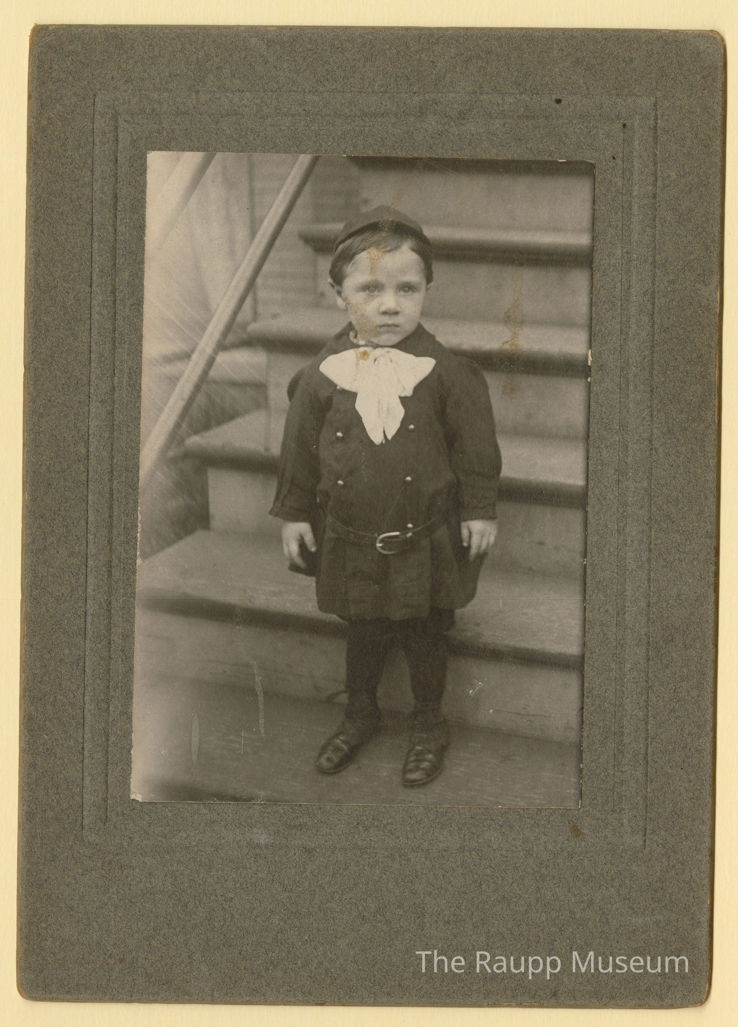 One (1) black and white cabinet photograph of a toddler boy standing on some steps. The boy is wearing a dark colored coat with shorts and tights, white ruffled scarf around the neck and a small black cap. He has leather black shoes on. Written on the back in pen is "Frank J. Eul Sr."