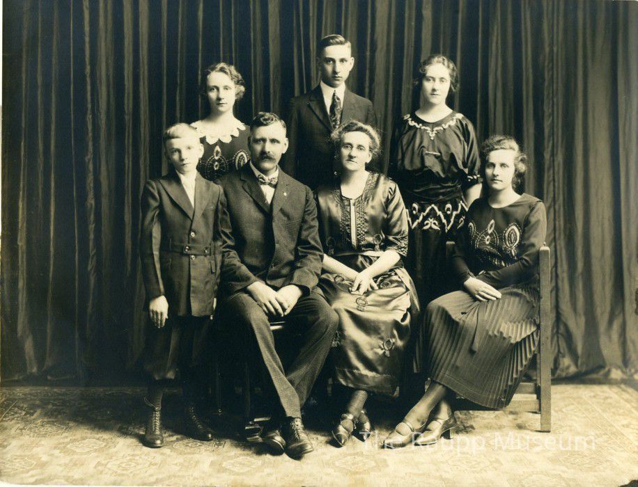 Professional black and white photographic print. Image of the Frank Weidner family. There are seven people in two rows; four people are standing, while the others are sitting. A young boy is standing next to the father on the left, who is next to the wife, sitting next to her daughter on the far right in the front row. They are all in front of a black curtain.