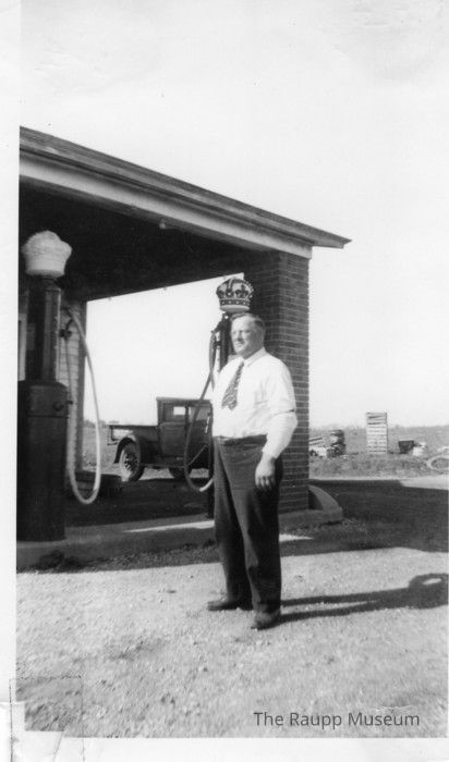 Accompanying archivist note indicates: "Frank Welter in front of his Standard Oil filling station, C. 1933. Sold regular and hi-test gasoline."Made/Created