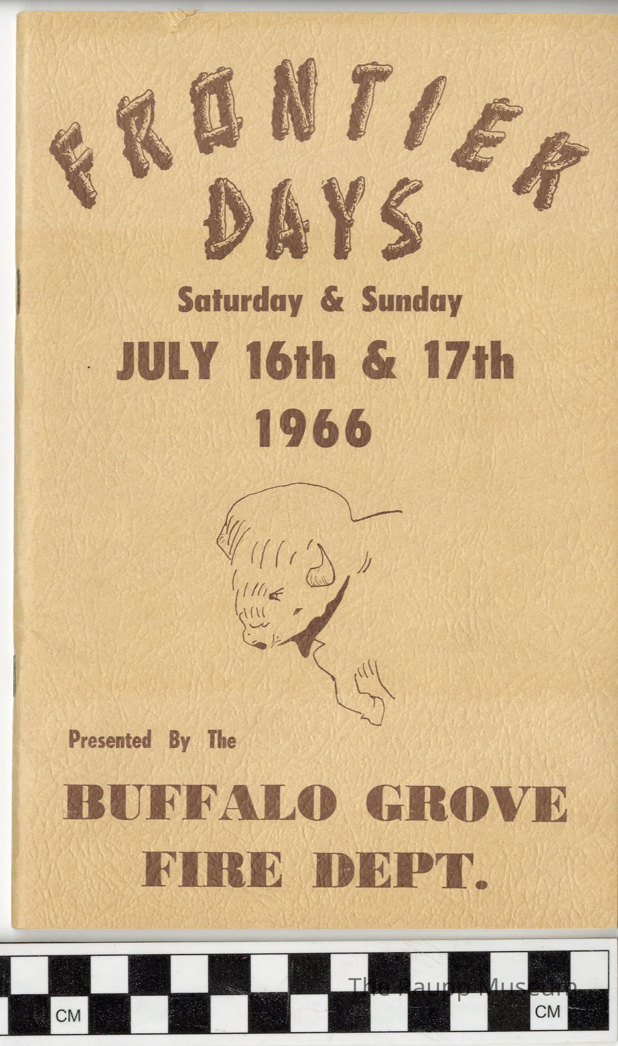 One (1) Frontier Days program for 1966. Front Title is "Frontier Days, Saturday and Sunday, July 16th & 17th 1966, Presented by the Buffalo Grove Fire Dept.". There is a hand drawn picture of a Buffalo Head on the cover. The Cover is brown cardstock and has two staples on the left side. The back cover has an advertisement for Ace Hardware. The pages contains lists of churches, organizations, and advertisements from local businesses.
