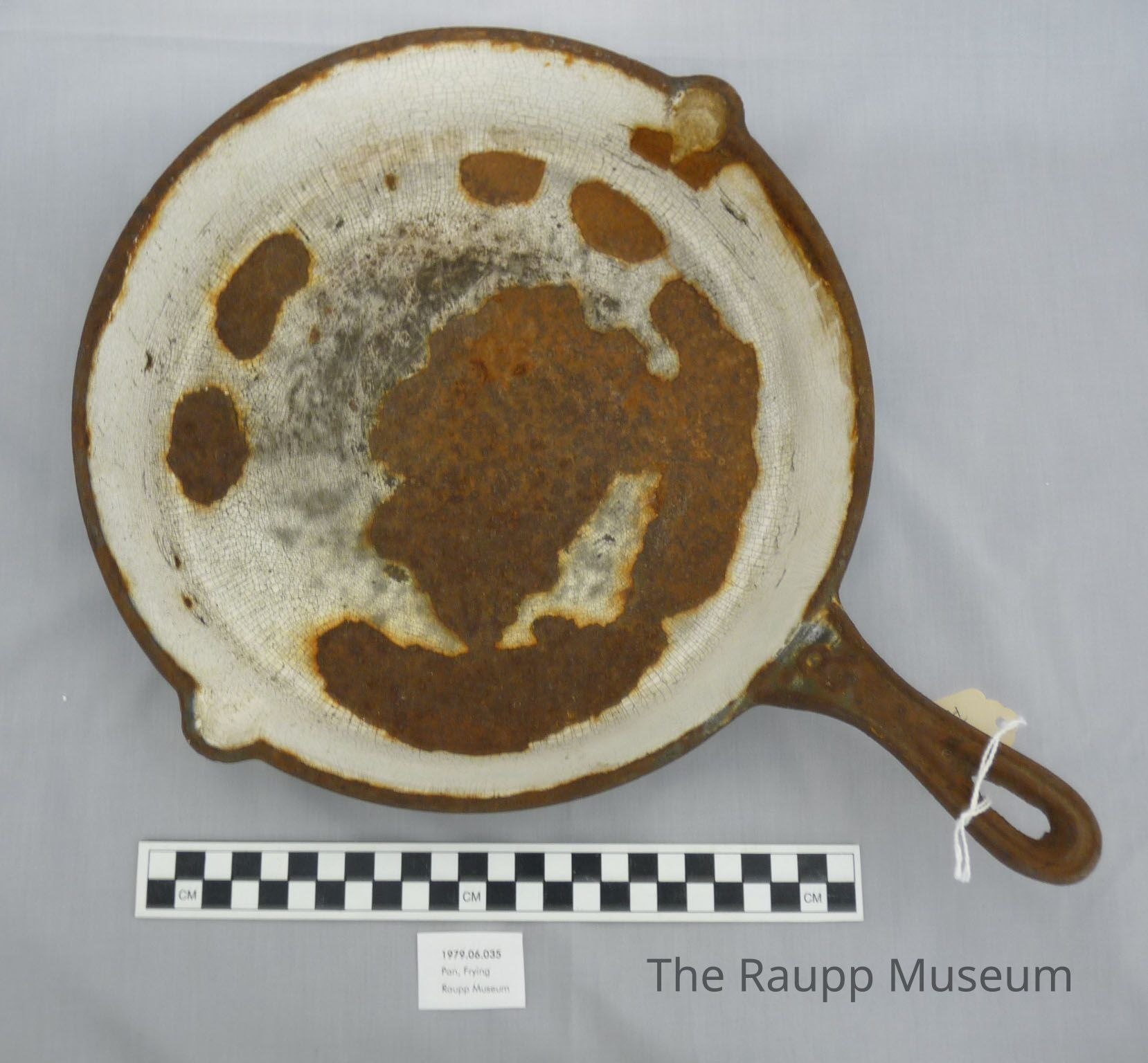 One (1) white and brown cast iron and enamel frying pan. Round pan with pouring spout at either end of pan, and a short handle. Pan was completely covered with white enamel but much of it has chipp off to show cast iron underneath. There is a raised "#8" embossed on the handle.Dimensions