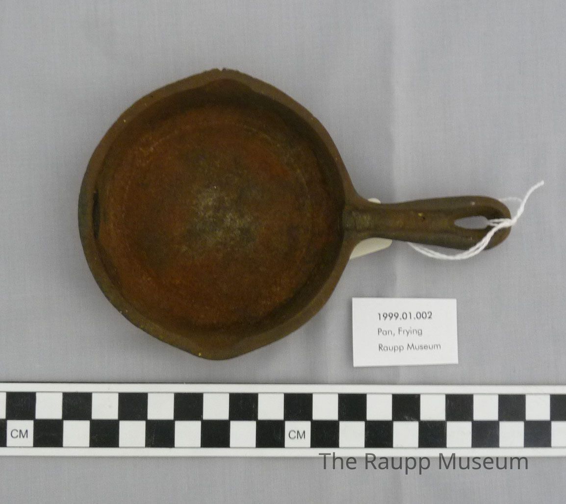 One (1) brown cast iron frying pan. Frying pan is miniature. There is a small pin hole in the middle of handle.