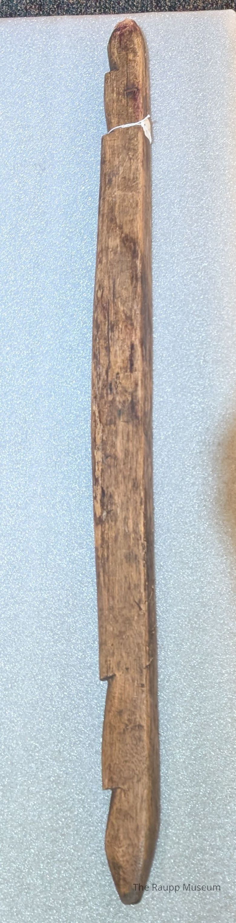 One (1) brown wood gambrel. 2 notches each end. Blood stains at one end. Wood is straight across with no bend. Ends are rounded.