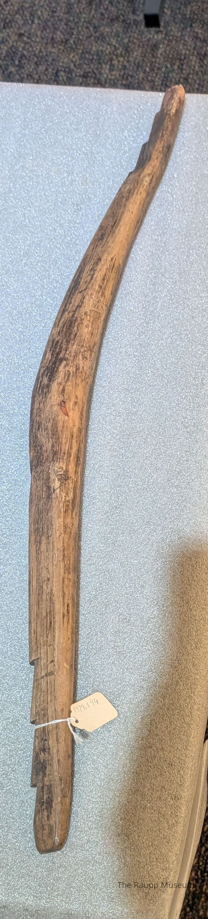 One (1) brown wood gambrel. Long piece of wood with 3 notched ends - has bend in middle.