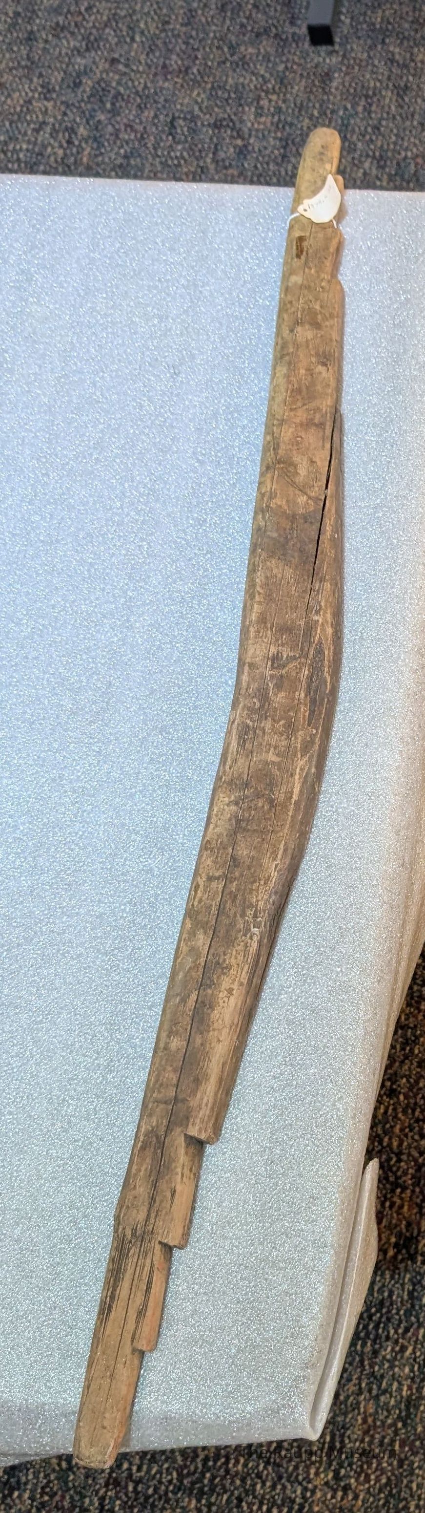 Long piece of wood with 3 notches, eachslight bend in middle. For hanging a carcass for butchering.