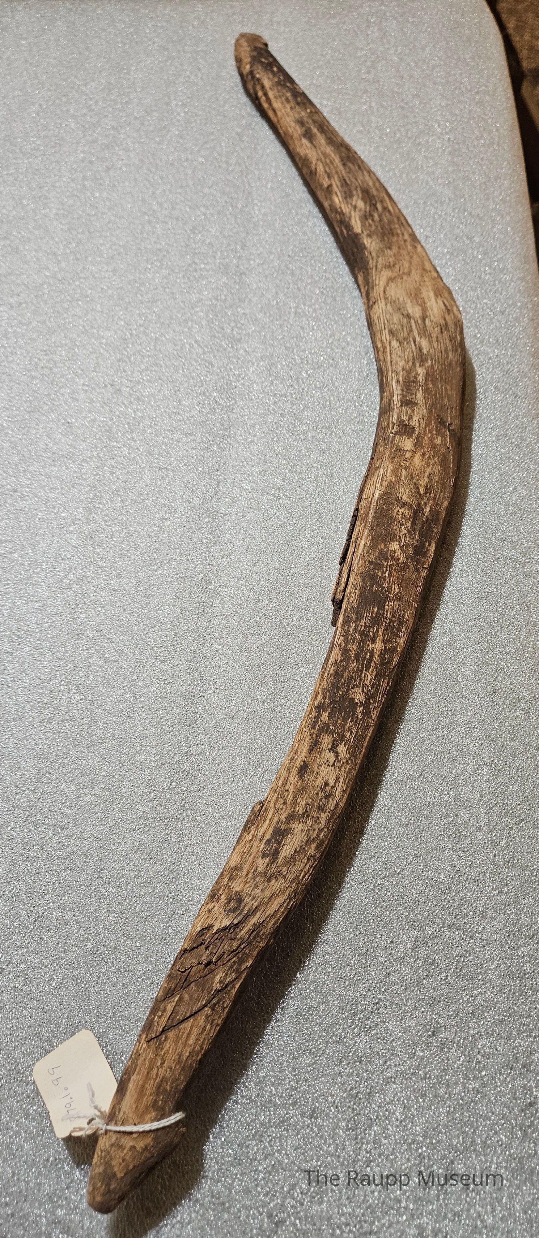 One (1) brown wood gambrel. Long piece of wood with 1 notch at each end. The wood is very irregular with splits showing at one end.
