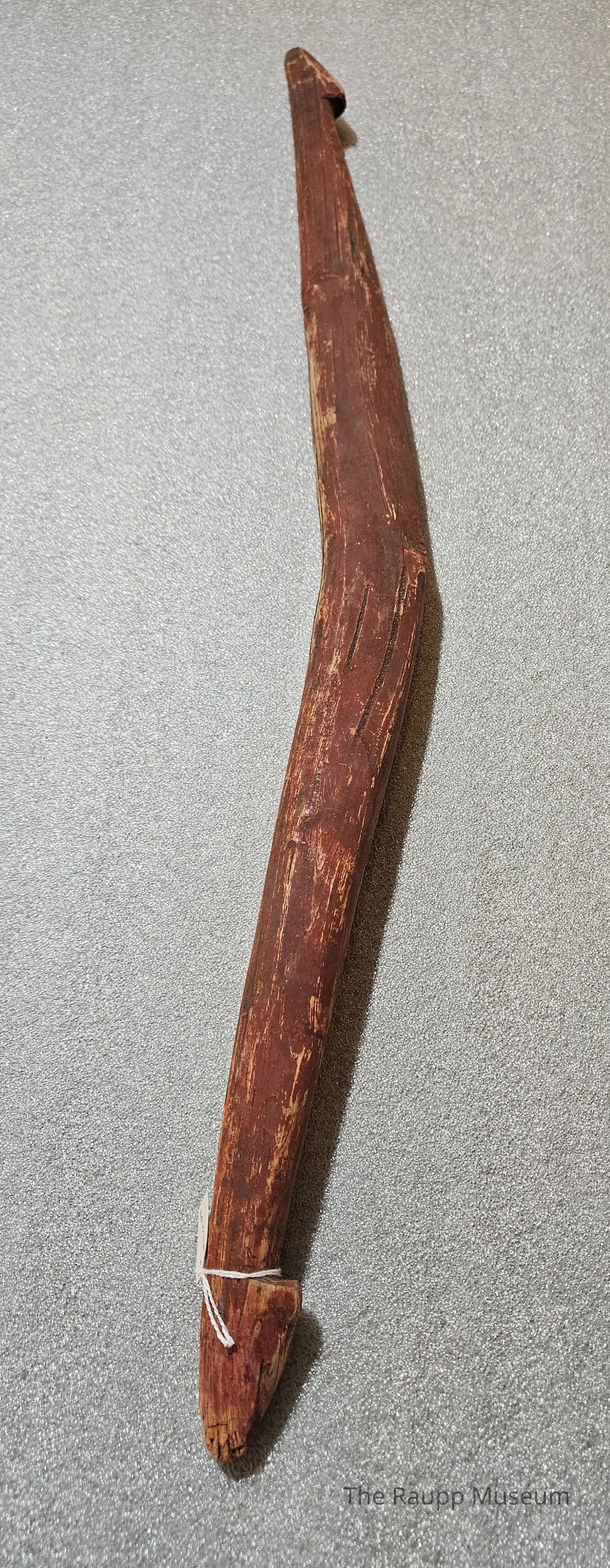 One (1) brown wood gambrel. Long piece of wood with 1 notch at each end. Wood is slightly wider at the mid section.