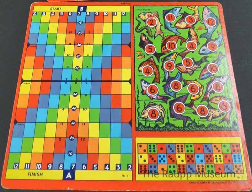 Square color cardboard game card. With blue background on one side with Dog Race game labeled "Board B," Shuffleboard labeled "No. 4," Baseball labeled "No. 5," and Alley-Up labeled "No.6." The reverse side has a red border with large colorful grid labeled "No. 1," Fish-pond labeled "No.2," and a dice grid game labeled "No. 3."Made/Created