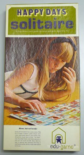 Card game "Happy Days Solitaire" marked "no.143" and box with separate lid. Set includes cardboard game board (three sections), instructions and set of 40 playing cards. Box lid features an image of a child wearing a white dress and purple hair bow playing the game.Dimensions