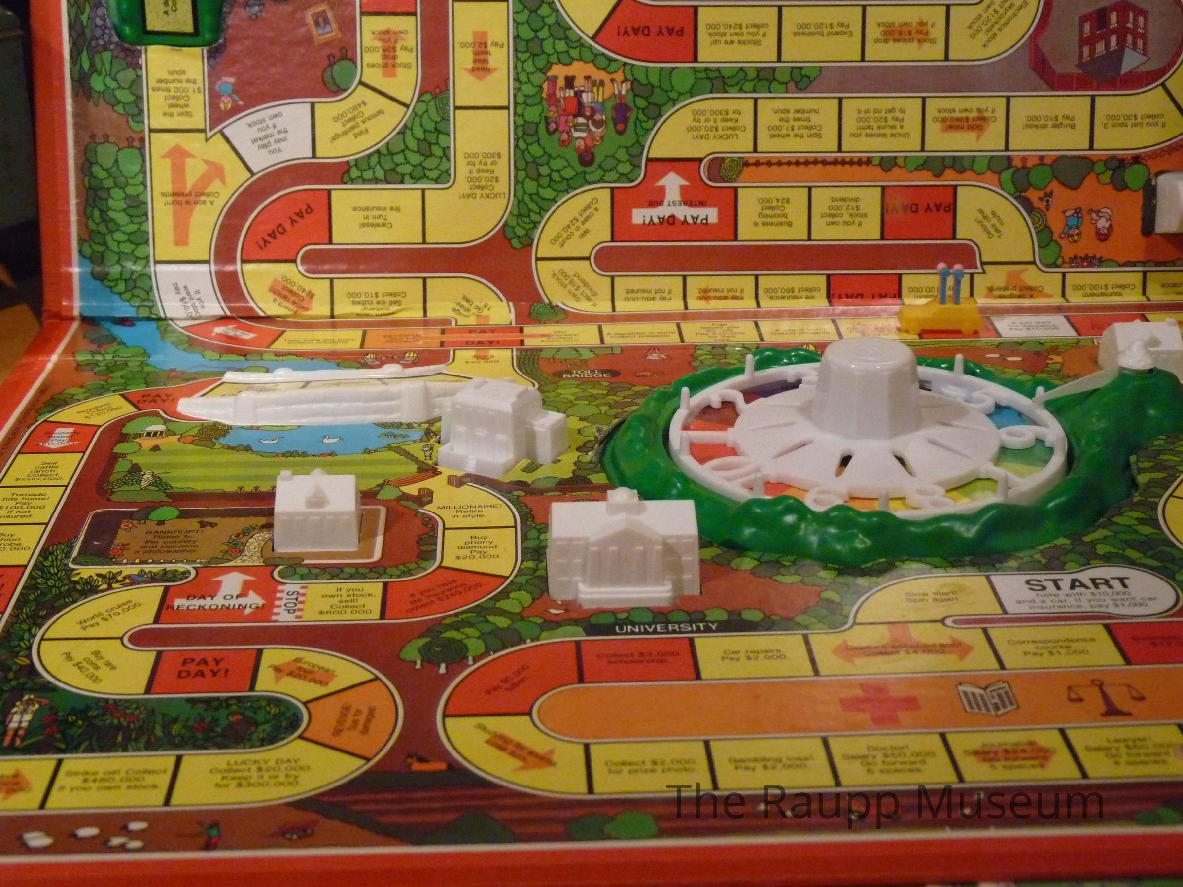 Board game "Game of Life" and storage box with separate lid. All game pieces intact. It is mounted to a heavy, red cardboard backing with a center horizontal fold. Illustration of a winding yellow track around the board with white plastic buildings and numbered spin dial in the center.Material