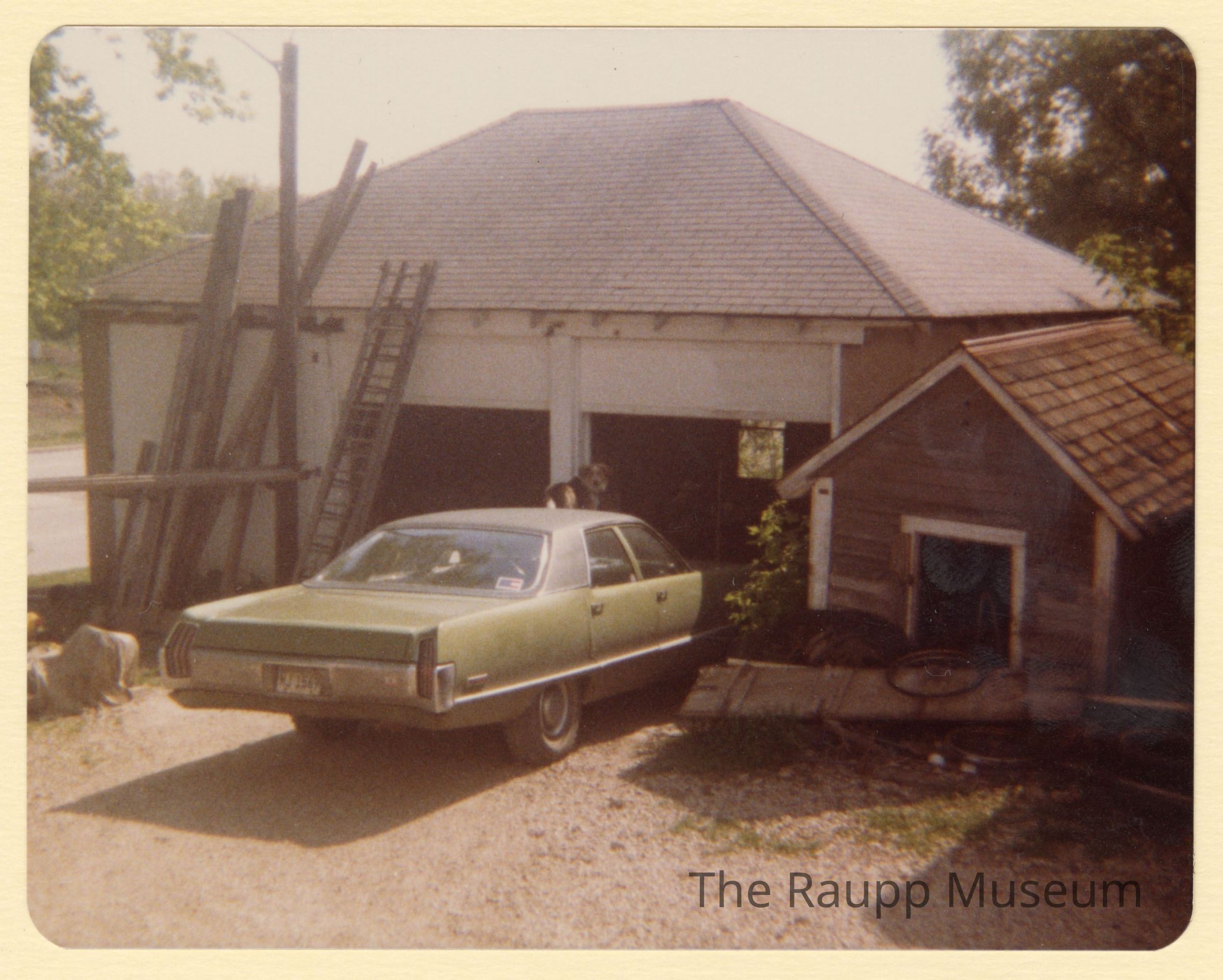 One (1) color photograph of a garage and car. The garage is two car garage door with an extension on the right side. On the left of building is a small shed wooden structure with various materials in front. On garage is a wooden ladder. In front is a green car, with a dog on the front looking back at the camera. The front of the car is slightly in the garage.