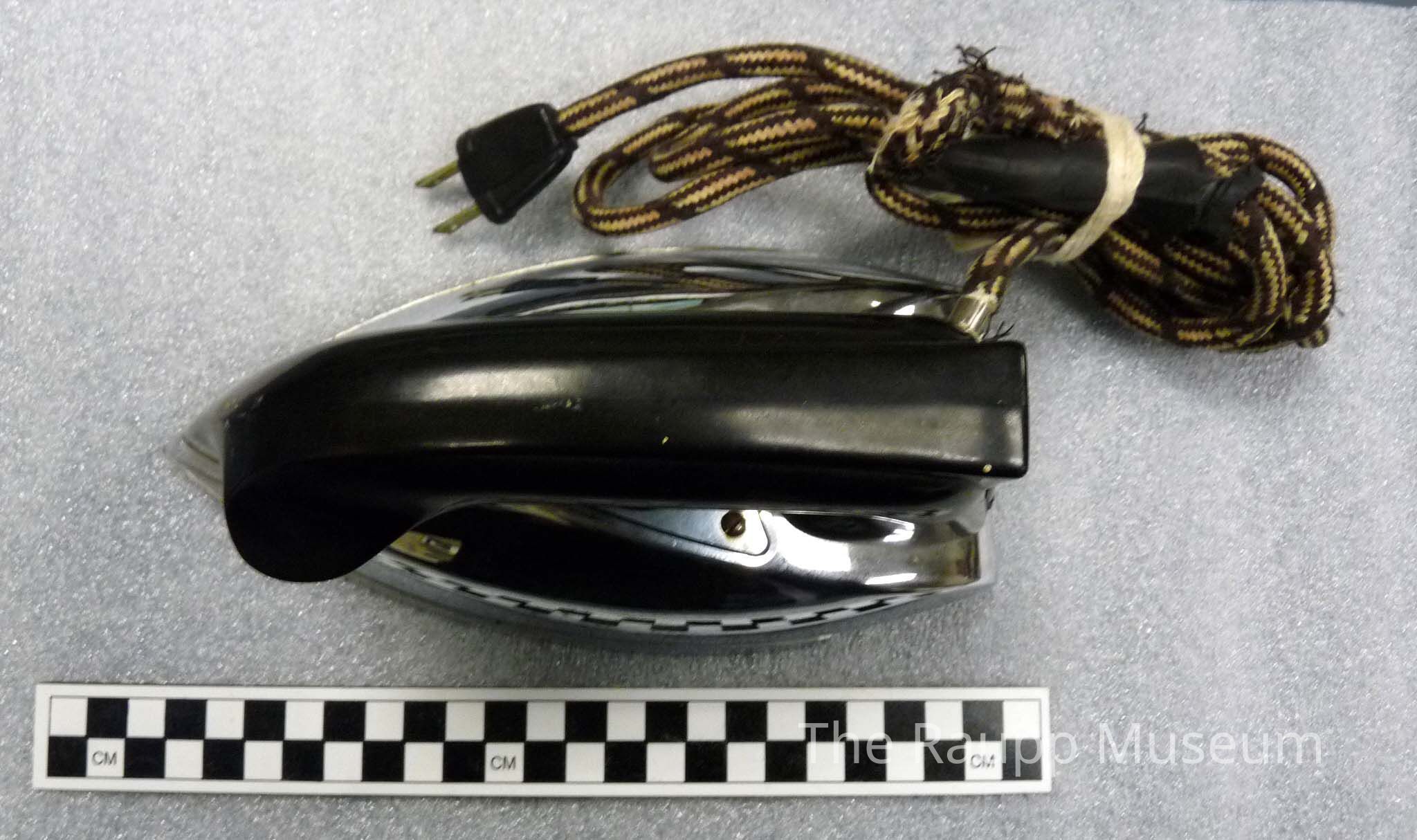 One (1) General Electric flatiron with rope cord attached. The iron has a black curved handle, a dial with settings silk, cotton, linen, wool. It is chrome iron with a plastic black handle with thumbrest. Cord is brown and white cloth covered and is attached to iron (will not unplug from iron). There is info on iron is tamped on handle and on base of iron. Base of iron stamped with: "eneral Electric Volts 115, Watts 850, Bridgeport Conn., Ontario, Calif, Made in USA. Cat. No 119F107, For AC or DC", and includes a large list of patent numbers.