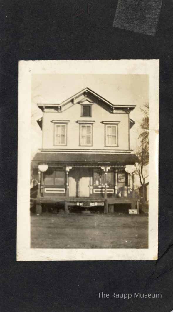 One (1) black and white photo of Geo. M. Weidner (Aptakisic) General Store, located on the SE corner of Aptakisic and Weiland Roads, owned by Geo. M. and Clara Weidner. The photo is mounted on a piece of black cardboard, and has a torn photo on the back (only a small portion of the bottom remains). There is a handwritten pencil label "Geo Weidner's Store". Photo shows a Victorian style building, with 2-stories, an attic, open front porch, two windows and a door on first floor, 3 windows second floor, one window attic.Made/Created